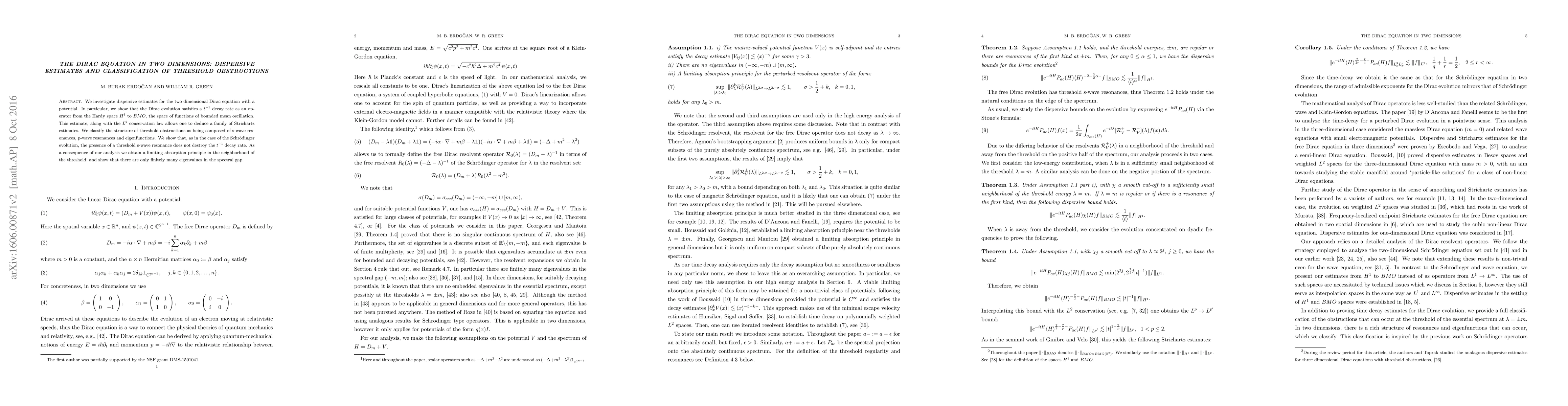This paper investigates dispersive estimates for the two-dimensional Dirac equation with potential, proving a $t^{-1}$ decay rate for the Dirac evolution from $H^1$ to $BMO$. It classifies threshold obstructions into s-wave, p-wave resonances, and eigenfunctions, demonstrating that s-wave resonances do not disrupt the decay rate.