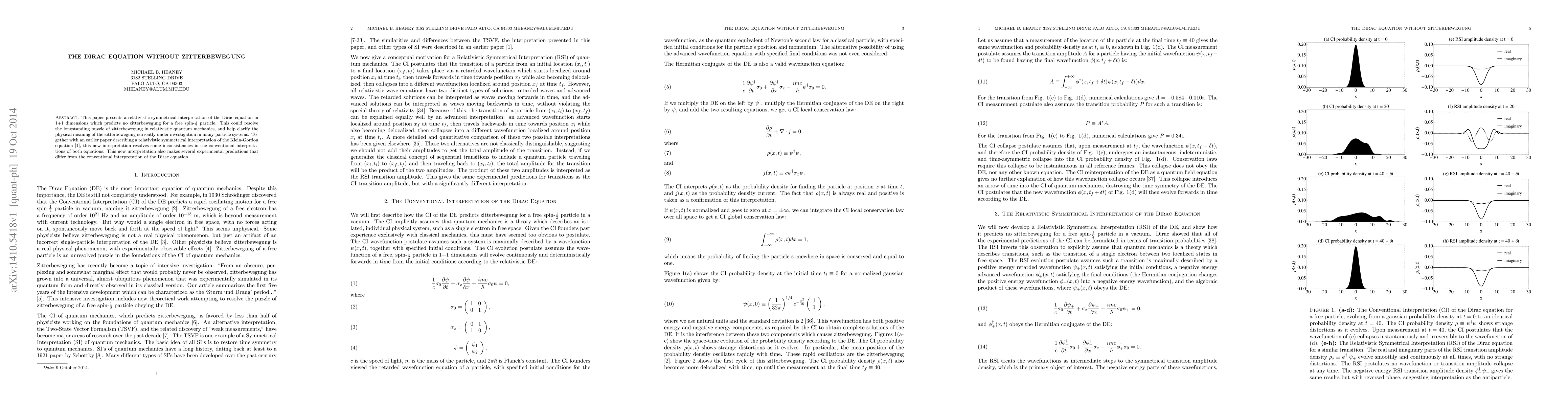 This paper proposes a relativistic symmetrical interpretation of the Dirac equation in 1+1 dimensions, predicting no zitterbewegung for free spin-1/2 particles, potentially resolving the longstanding puzzle of zitterbewegung and clarifying its physical meaning in many-particle systems. It also addresses inconsistencies in conventional interpretations of both the Dirac and Klein-Gordon equations.