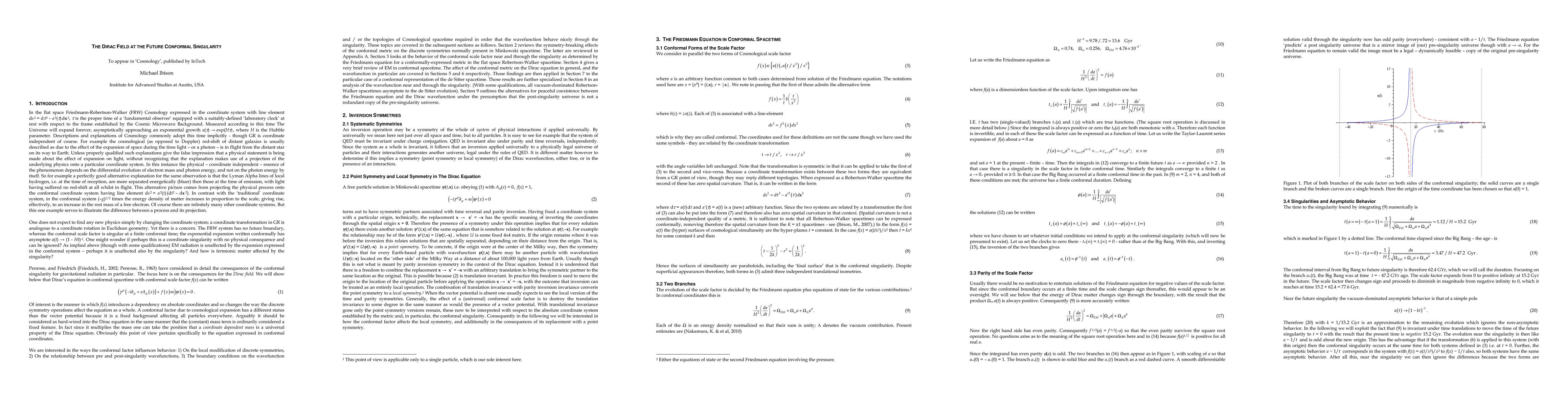 We examine in detail the effect of the conformal factor associated with the Friedmann-Robertson-Walker spacetimes on the discrete symmetries usually present in the Dirac theory and analyze the behavior of the Dirac wavefunction near the future conformal singularity. We find that only two of the 4 bi-spinor components survive to the boundary, one effect of which is to cause the geodesics to experience a drag towards the Hubble frame. We then present arguments for the existence of a genuine boundary condition on the wavefunction at the future conformal singularity based upon the assumption there is no redundant copy of the universe in the post-conformal singularity era. This future boundary condition affects the spectral decomposition of the wavefunction, and this maybe locally testable at the present time.