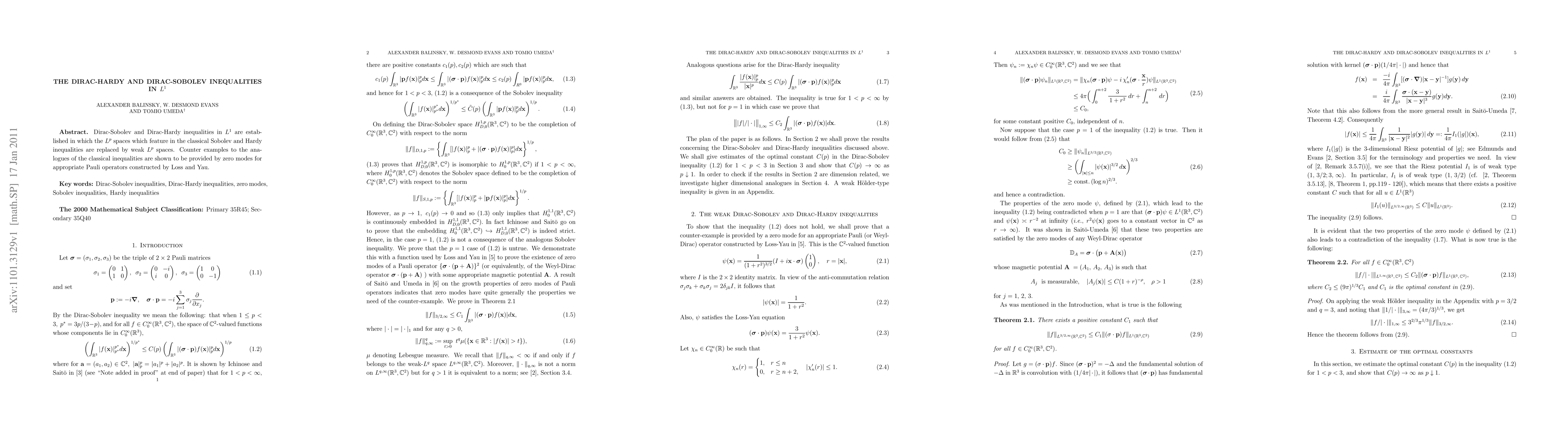 This paper establishes Dirac-Sobolev and Dirac-Hardy inequalities in $L^1$ using weak $L^p$ spaces instead of classical $L^p$ spaces. It also provides counterexamples to the classical inequalities using zero modes from Pauli operators by Loss and Yau.