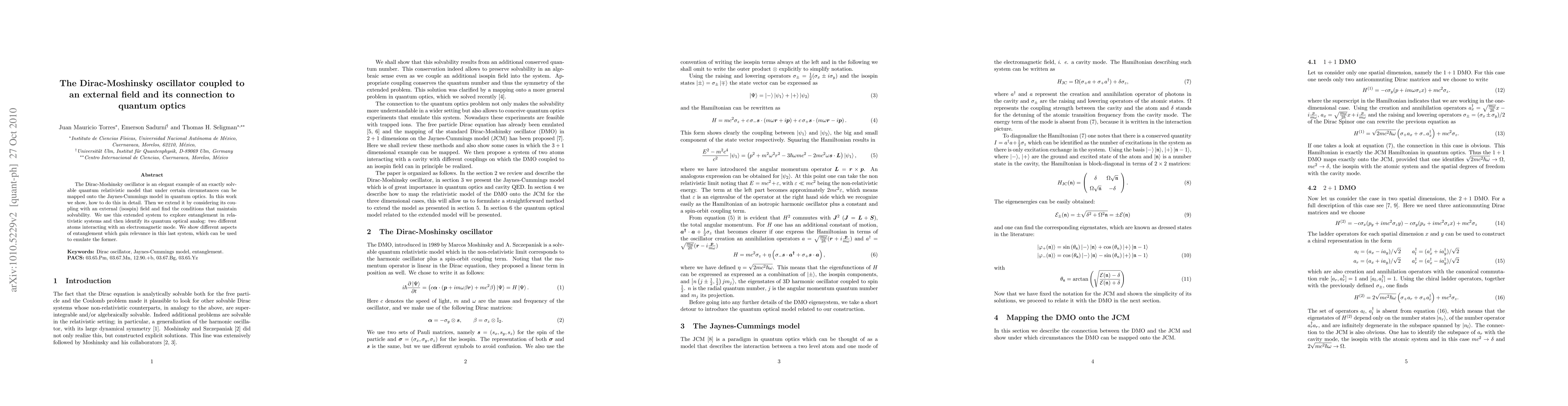 This paper explores the Dirac-Moshinsky oscillator's mapping to the Jaynes-Cummings model in quantum optics, extends it by coupling it to an external isospin field while maintaining solvability, and uses it to study entanglement in relativistic systems, identifying its quantum optical analog involving two atoms interacting with an electromagnetic mode.
