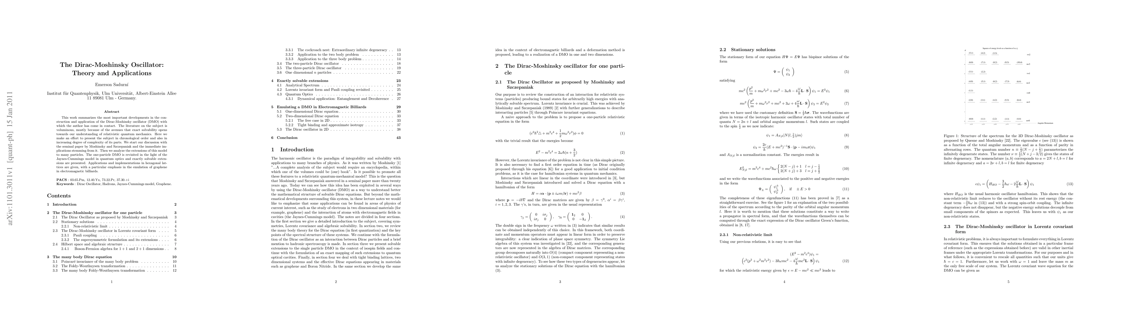 This paper reviews the development and applications of the Dirac-Moshinsky oscillator, highlighting its exact solvability and relevance to relativistic quantum mechanics, and explores its extensions to many particles and its use in modeling graphene in electromagnetic systems.