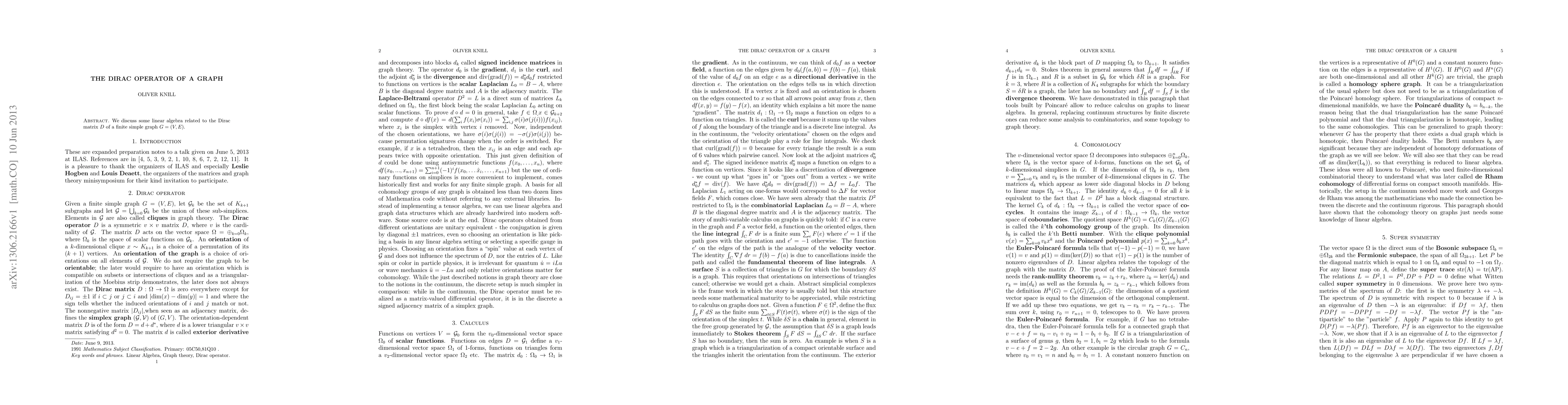 We discuss some linear algebra related to the Dirac matrix D of a finite simple graph G=(V,E).