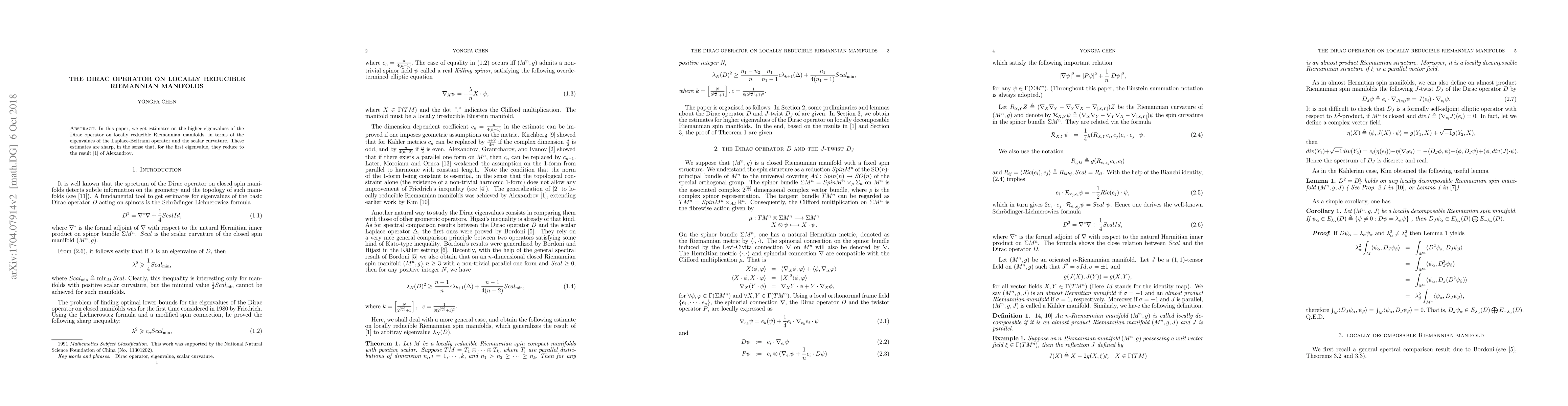 This paper provides sharp estimates for the higher eigenvalues of the Dirac operator on locally reducible Riemannian manifolds, relating them to the eigenvalues of the Laplace-Beltrami operator and scalar curvature, with the first eigenvalue estimate aligning with Alexandrov's result.