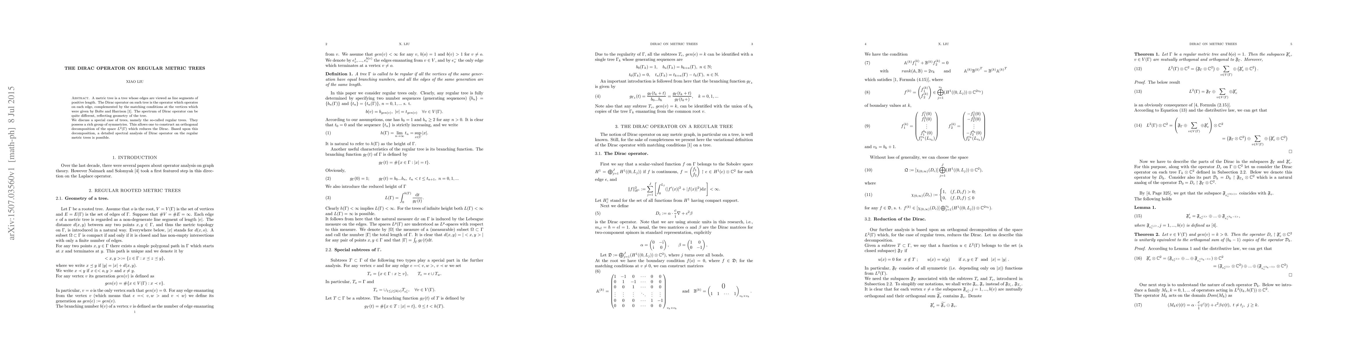 A metric tree is a tree whose edges are viewed as line segments of positive length. The Dirac operator on such tree is the operator which operates on each edge, complemented by the matching conditions at the vertices which were given by Bolte and Harrison \cite{BolteHarrison2003}. The spectrum of Dirac operator can be quite different, reflecting geometry of the tree. We discuss a special case of trees, namely the so-called regular trees. They possess a rich group of symmetries. This allows one to construct an orthogonal decomposition of the space $L^2(\Gamma)$ which reduces the Dirac. Based upon this decomposition, a detailed spectral analysis of Dirac operator on the regular metric trees is possible.
