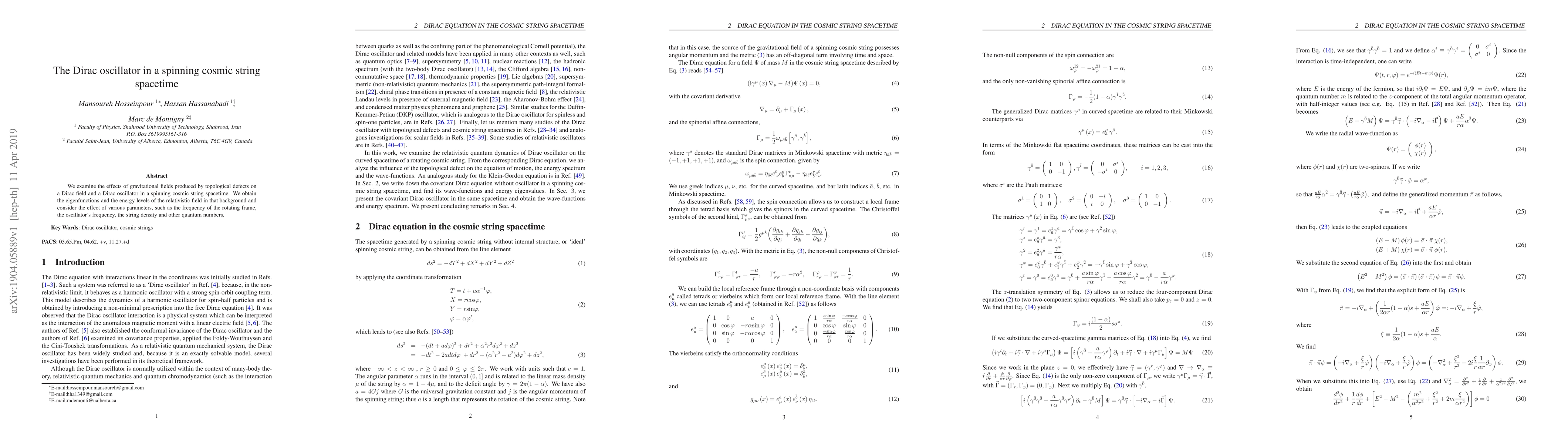 This paper investigates the behavior of a Dirac oscillator within a spinning cosmic string's gravitational field, determining its eigenfunctions and energy levels. It considers how parameters like rotation frequency and oscillator frequency affect the relativistic field in this topological defect spacetime.
