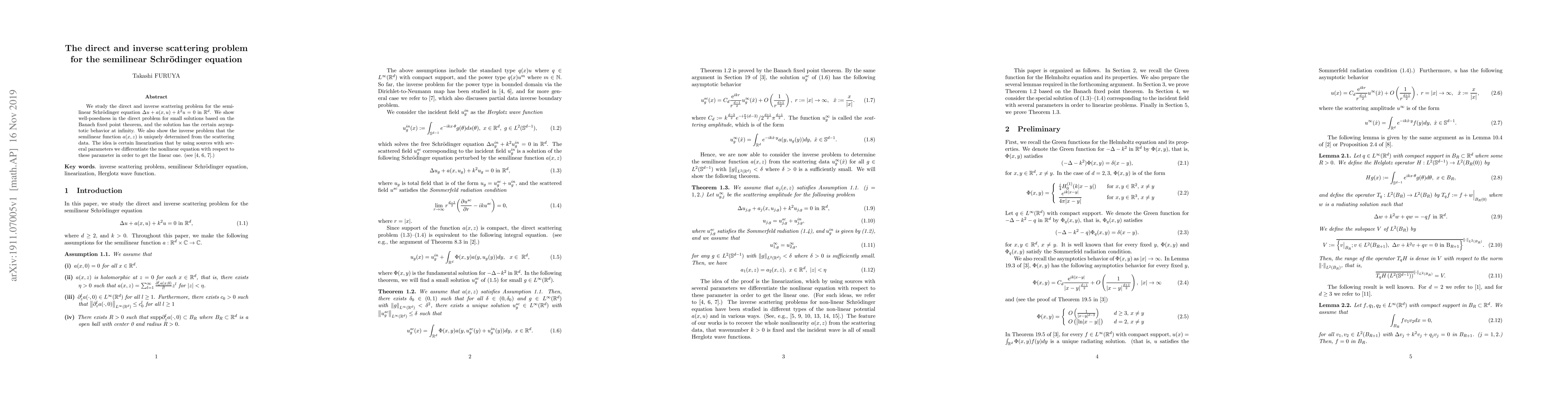 This paper investigates the direct and inverse scattering problems for the semilinear Schrödinger equation, proving well-posedness for small solutions and demonstrating unique determination of the semilinear function from scattering data through a linearization technique involving differentiation with respect to parameters.