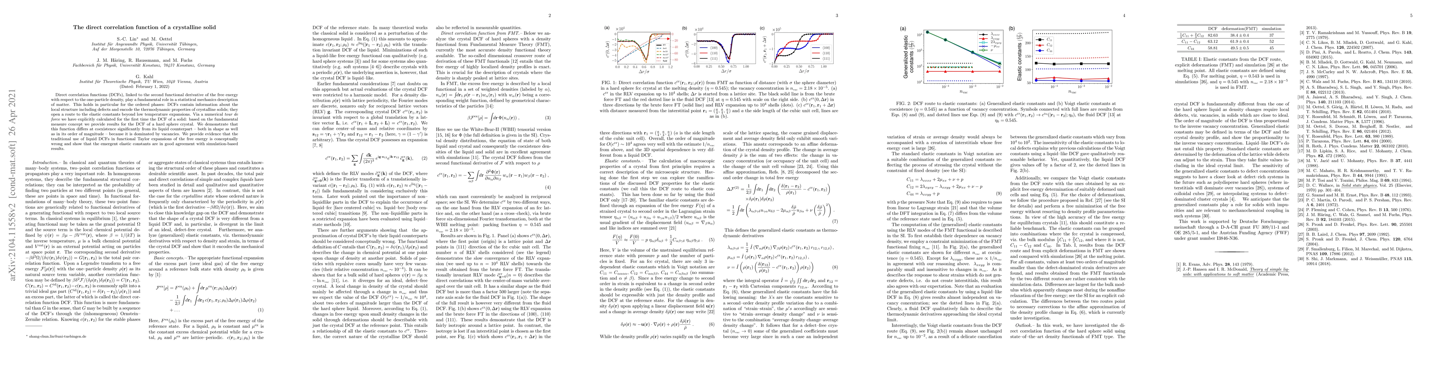 Direct correlation functions (DCFs), linked to the second functional derivative of the free energy with respect to the one-particle density, play a fundamental role in a statistical mechanics description of matter. This holds in particular for the ordered phases: DCFs contain information about the local structure including defects and encode the thermodynamic properties of crystalline solids; they open a route to the elastic constants beyond low temperature expansions. Via a numerical tour de force we have explicitly calculated for the first time the DCF of a solid: based on the fundamental measure concept we provide results for the DCF of a hard sphere crystal. We demonstrate that this function differs at coexistence significantly from its liquid counterpart - both in shape as well as in its order of magnitude - because it is dominated by vacancies. We provide evidence that the traditional use of liquid DCFs in functional Taylor expansions of the free energy is conceptually wrong and show that the emergent elastic constants are in good agreement with simulation-based results.