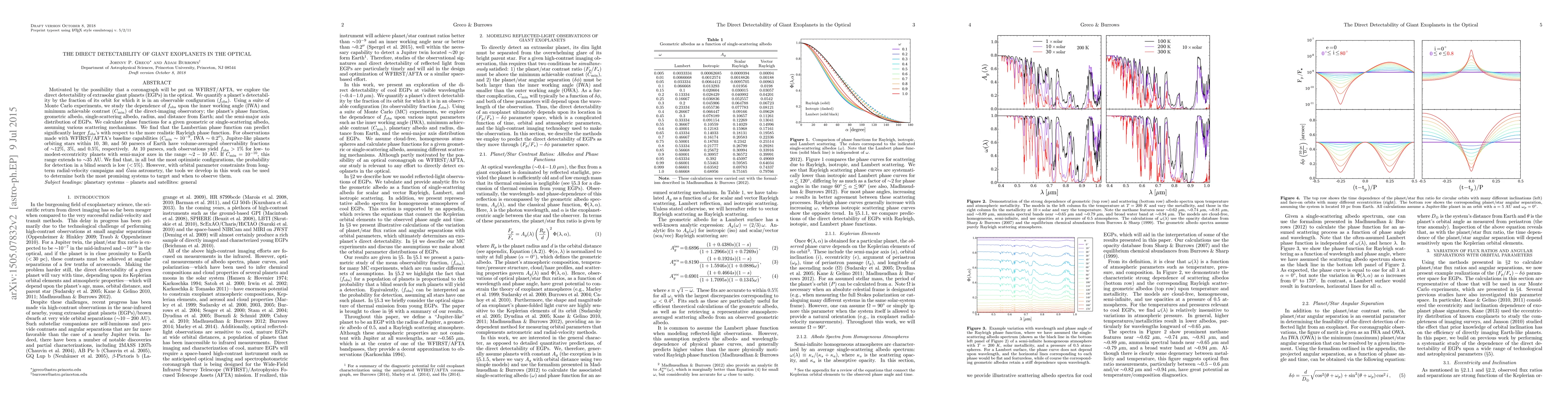 Motivated by the possibility that a coronagraph will be put on WFIRST/AFTA, we explore the direct detectability of extrasolar giant planets (EGPs) in the optical. We quantify a planet's detectability by the fraction of its orbit for which it is in an observable configuration ($f_\mathrm{obs}$). Using a suite of Monte Carlo experiments, we study the dependence of $f_\mathrm{obs}$ upon the inner working angle (IWA) and minimum achievable contrast ($C_\mathrm{min}$) of the direct-imaging observatory; the planet's phase function, geometric albedo, single-scattering albedo, radius, and distance from Earth; and the semi-major axis distribution of EGPs. We calculate phase functions for a given geometric or single-scattering albedo, assuming various scattering mechanisms. We find that the Lambertian phase function can predict significantly larger $f_\mathrm{obs}$'s with respect to the more realistic Rayleigh phase function. For observations made with WFIRST/AFTA's baseline capabilities ($C_\mathrm{min}\sim10^{-9}$, $\mathrm{IWA}\sim0.2''$), Jupiter-like planets orbiting stars within 10, 30, and 50 parsecs of Earth have volume-averaged observability fractions of ${\sim}$12%, 3%, and 0.5%, respectively. At 10 parsecs, such observations yield $f_\mathrm{obs}>1\%$ for low- to modest-eccentricity planets with semi-major axes in the range ${\sim}2 - 10$ AU. If $C_\mathrm{min}=10^{-10}$, this range extends to ${\sim}35$ AU. We find that, in all but the most optimistic configurations, the probability for detection in a blind search is low (${<}\,5\%$). However, with orbital parameter constraints from long-term radial-velocity campaigns and Gaia astrometry, the tools we develop in this work can be used to determine both the most promising systems to target and when to observe them.