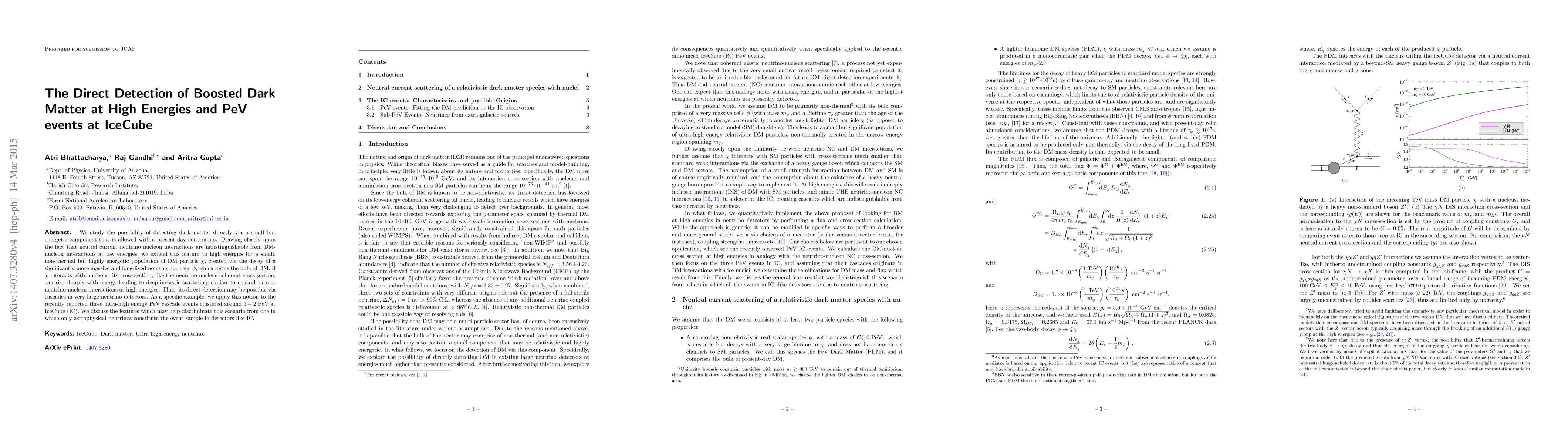 We study the possibility of detecting dark matter directly via a small but energetic component that is allowed within present-day constraints. Drawing closely upon the fact that neutral current neutrino nucleon interactions are indistinguishable from DM-nucleon interactions at low energies, we extend this feature to high energies for a small, non-thermal but highly energetic population of DM particle $\chi$, created via the decay of a significantly more massive and long-lived non-thermal relic $\phi$, which forms the bulk of DM. If $\chi$ interacts with nucleons, its cross-section, like the neutrino-nucleus coherent cross-section, can rise sharply with energy leading to deep inelastic scattering, similar to neutral current neutrino-nucleon interactions at high energies. Thus, its direct detection may be possible via cascades in very large neutrino detectors. As a specific example, we apply this notion to the recently reported three ultra-high energy PeV cascade events clustered around $1-2$ PeV at IceCube (IC). We discuss the features which may help discriminate this scenario from one in which only astrophysical neutrinos constitute the event sample in detectors like IC.