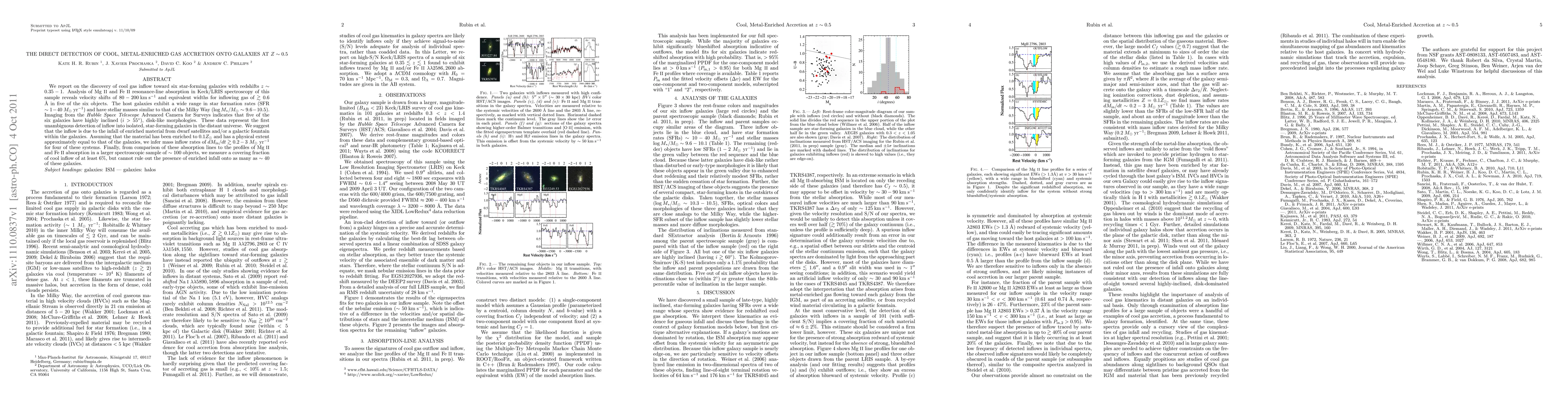 This paper reports the first unambiguous detection of cool, metal-enriched gas inflow towards six star-forming galaxies at redshifts z ~ 0.35 - 1, revealing significant velocity shifts and equivalent widths indicative of substantial mass inflow rates. The galaxies exhibit a wide range of star formation rates and disk-like morphologies.