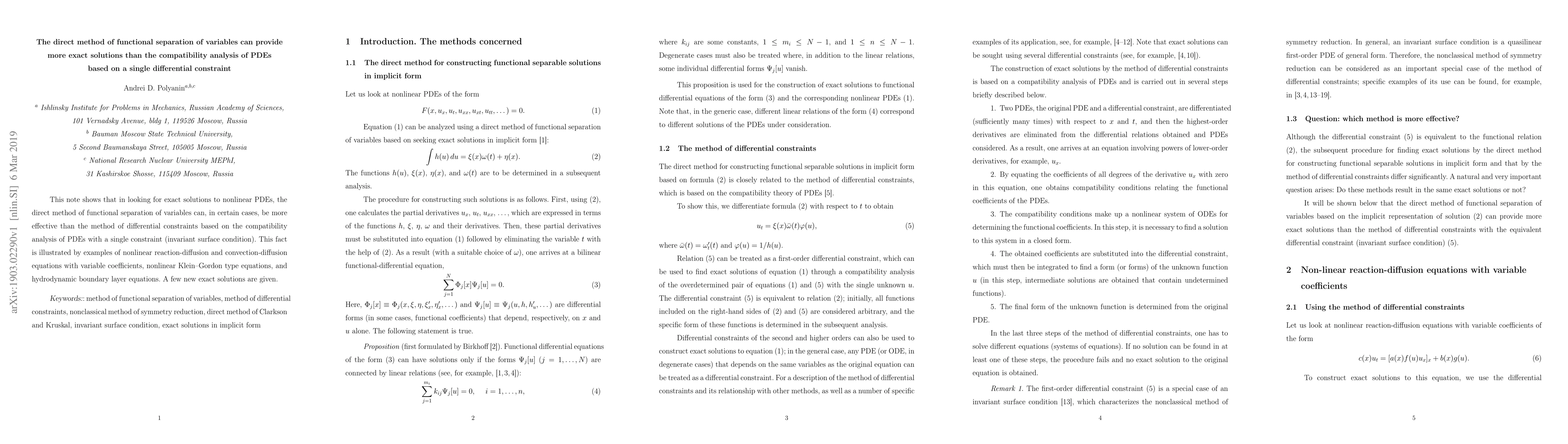 This note shows that in looking for exact solutions to nonlinear PDEs, the direct method of functional separation of variables can, in certain cases, be more effective than the method of differential constraints based on the compatibility analysis of PDEs with a single constraint (invariant surface condition). This fact is illustrated by examples of nonlinear reaction-diffusion and convection-diffusion equations with variable coefficients, nonlinear Klein--Gordon type equations, and hydrodynamic boundary layer equations. A few new exact solutions are given.