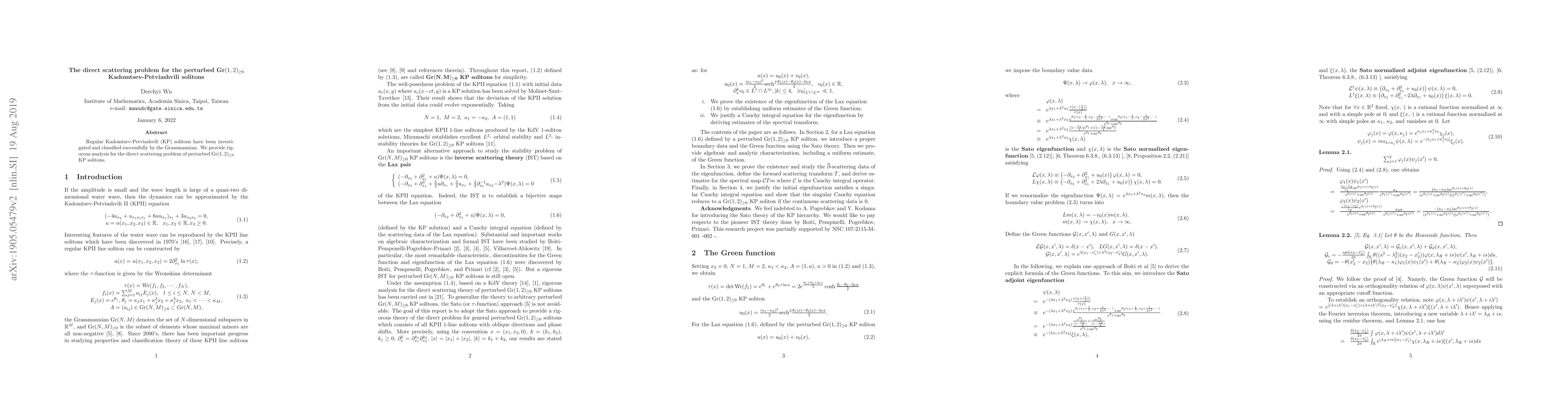 Regular Kadomtsev-Petviashvili (KP) solitons have been investigated and classified successfully by the Grassmannian. We provide rigorous analysis for the direct scattering problem of perturbed $\textrm{Gr}(1, 2)_{\ge 0}$ KP solitons.