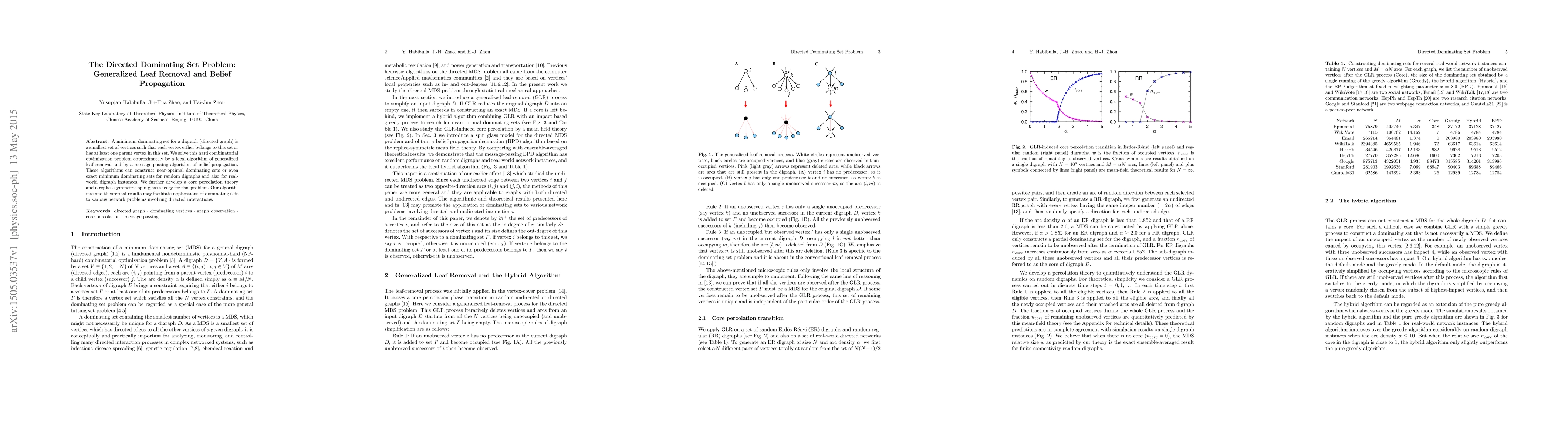 This paper presents approximate algorithms for solving the directed dominating set problem using generalized leaf removal and belief propagation, showing near-optimal performance on random and real-world digraphs. Additionally, it develops theoretical frameworks like core percolation and replica-symmetric spin glass theory to support these results.