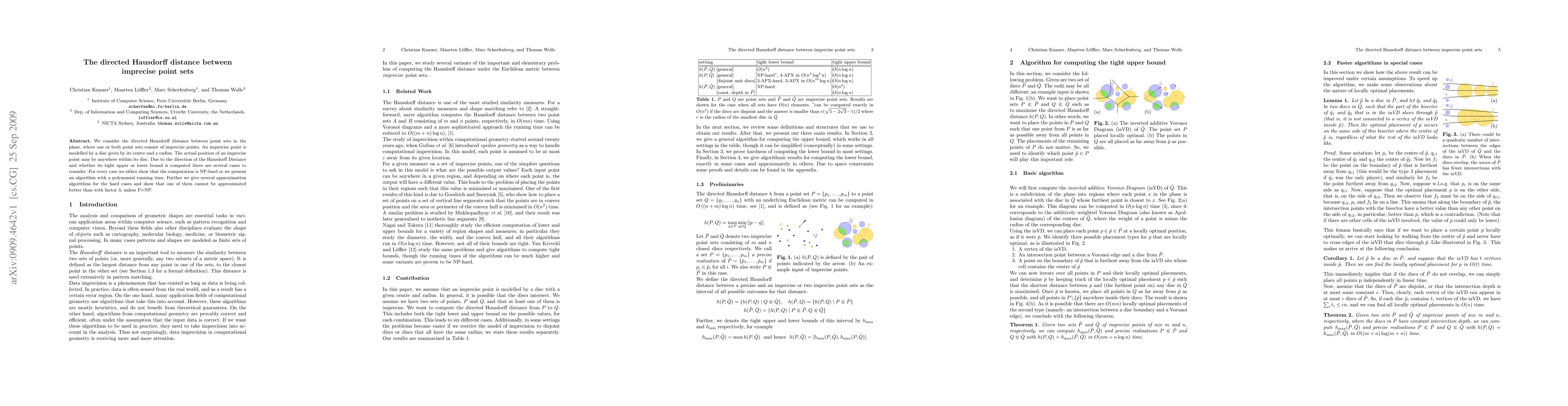The paper explores the directed Hausdorff distance between point sets in the plane, considering imprecise points modeled as discs with varying radii, finding polynomial-time algorithms for some cases and NP-hardness for others, with implications for approximation algorithms.