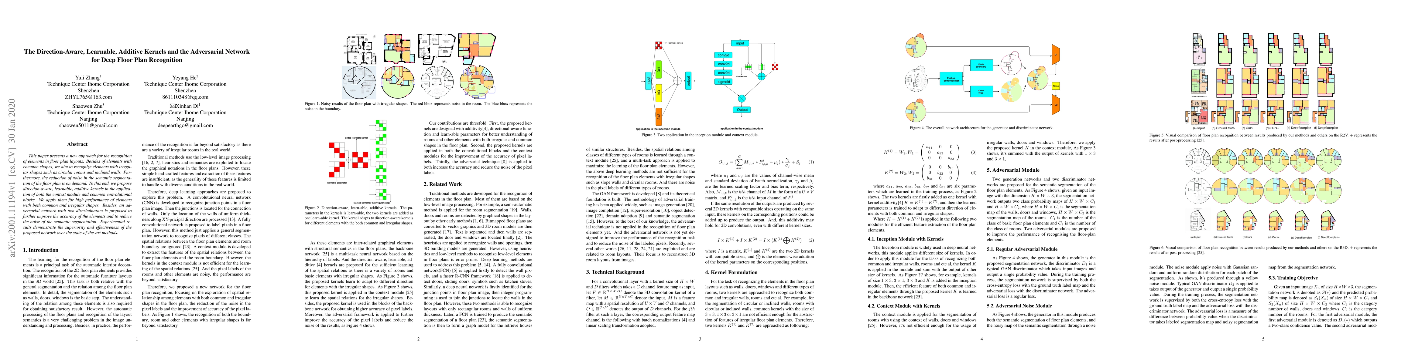 This paper introduces a novel deep learning approach for recognizing floor plan elements, including irregular shapes, using direction-aware, learnable additive kernels and an adversarial network with two discriminators to improve accuracy and reduce segmentation noise. Experimental results show superior performance compared to existing methods.