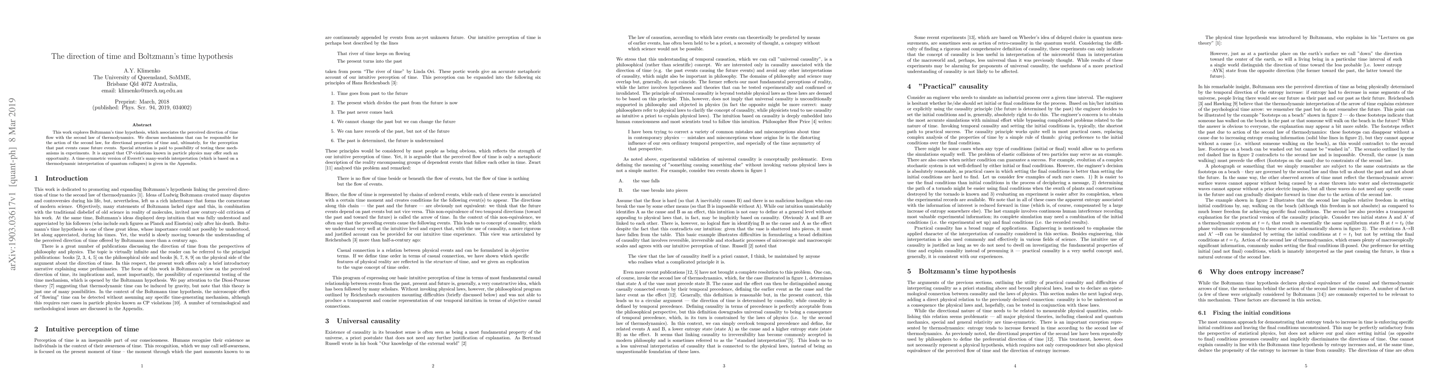 This work explores Boltzmann's time hypothesis, which associates the perceived direction of "time flow" with the second law of thermodynamics. We discuss mechanisms that can be responsible for the action of the second law, for directional properties of time and, ultimately, for the perception that past events cause future events. Special attention is paid to possibility of testing these mechanisms in experiments. It is argued that CP-violations known in particle physics may offer such an opportunity. A time-symmetric version of Everett's many-worlds interpretation (which is based on a thermodynamic interpretation of quantum collapses) is given in the Appendix.