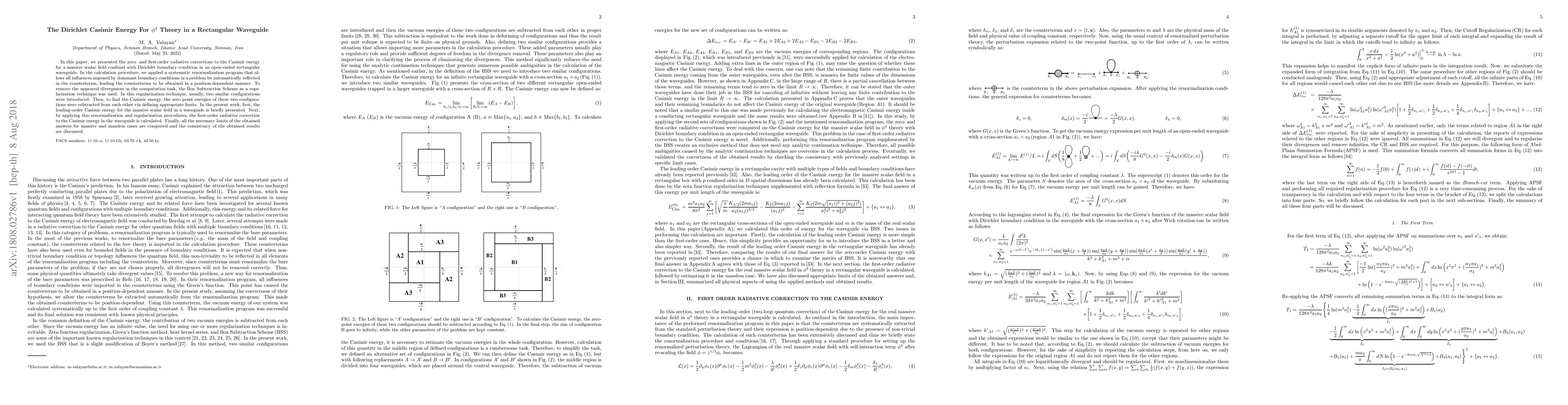 This paper calculates the zero- and first-order radiative corrections to the Casimir energy for a massive scalar field in a rectangular waveguide with Dirichlet boundary conditions, employing a systematic renormalization program and the Box Subtraction Scheme for regularization to handle divergences.