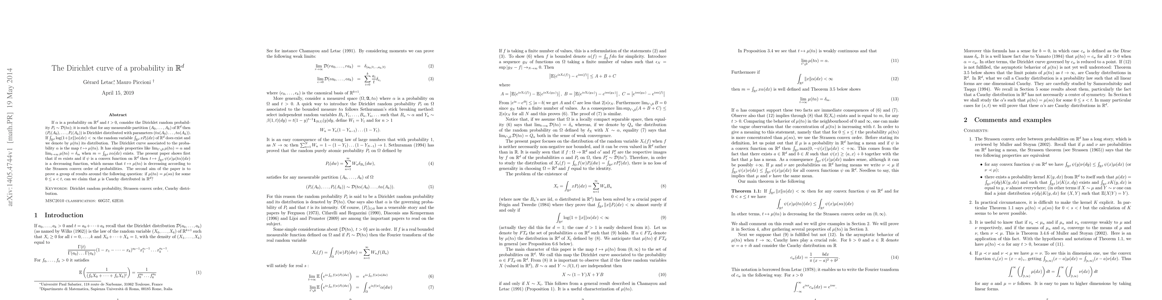Dirichlet random probability $P_t\sim\mathcal{D}(t\alpha) ;$ it is such that