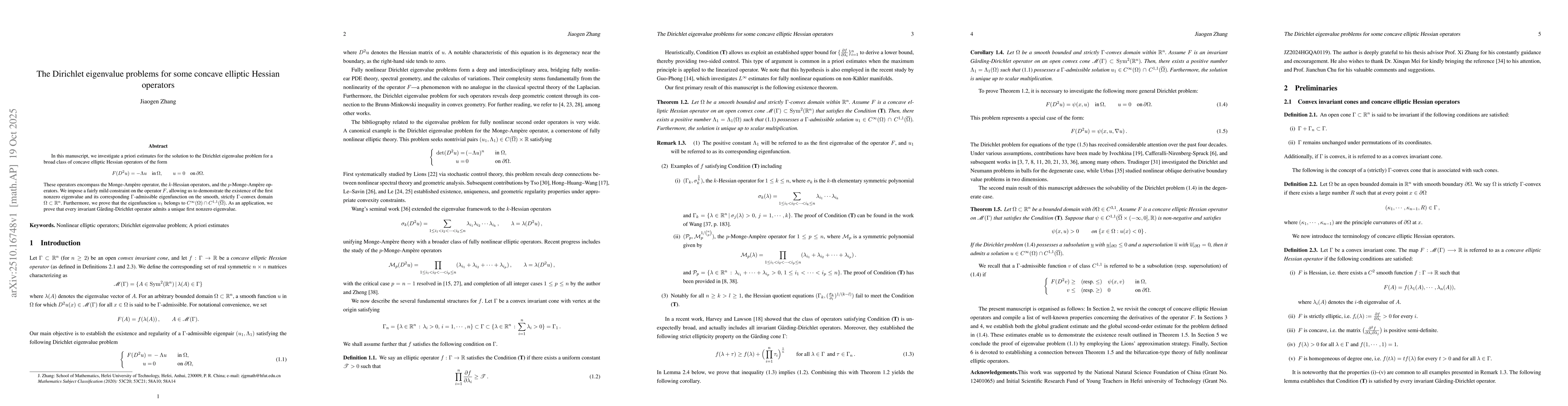 The research employs a combination of variational methods, geometric analysis, and nonlinear PDE techniques to study the Dirichlet eigenvalue problem for concave elliptic Hessian operators. It builds on previous work by Lions and Caffarelli-Nirenberg-Spruck, extending results to more general operators and domains.