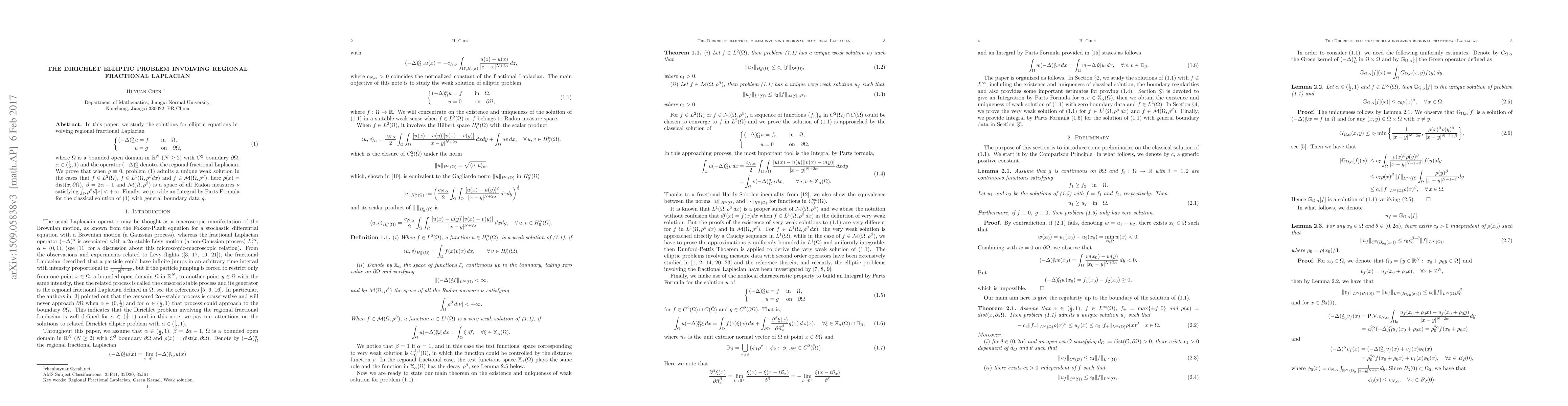 This paper investigates the Dirichlet elliptic problem involving the regional fractional Laplacian, proving the existence of a unique weak solution under various conditions on the function \( f \) and providing an Integral by Parts Formula for classical solutions with general boundary data.