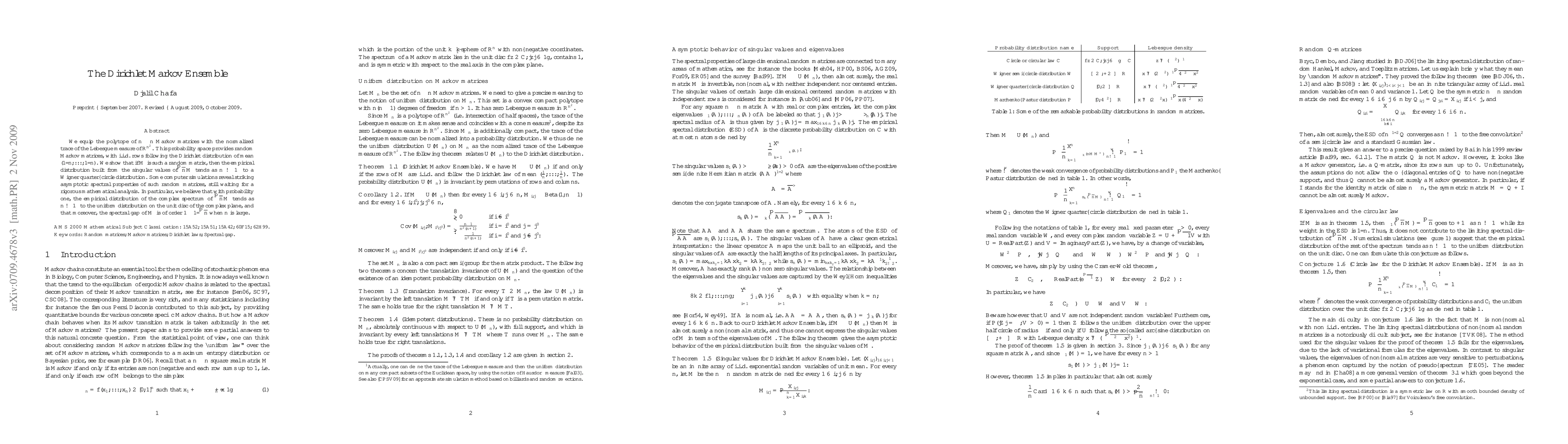 We equip the polytope of $n\times n$ Markov matrices with the normalized trace of the Lebesgue measure of $\mathbb{R}^{n^2}$. This probability space provides random Markov matrices, with i.i.d. rows following the Dirichlet distribution of mean $(1/n,...,1/n)$. We show that if $\bM$ is such a random matrix, then the empirical distribution built from the singular values of$\sqrt{n} \bM$ tends as $n\to\infty$ to a Wigner quarter--circle distribution. Some computer simulations reveal striking asymptotic spectral properties of such random matrices, still waiting for a rigorous mathematical analysis. In particular, we believe that with probability one, the empirical distribution of the complex spectrum of $\sqrt{n} \bM$ tends as $n\to\infty$ to the uniform distribution on the unit disc of the complex plane, and that moreover, the spectral gap of $\bM$ is of order $1-1/\sqrt{n}$ when $n$ is large.