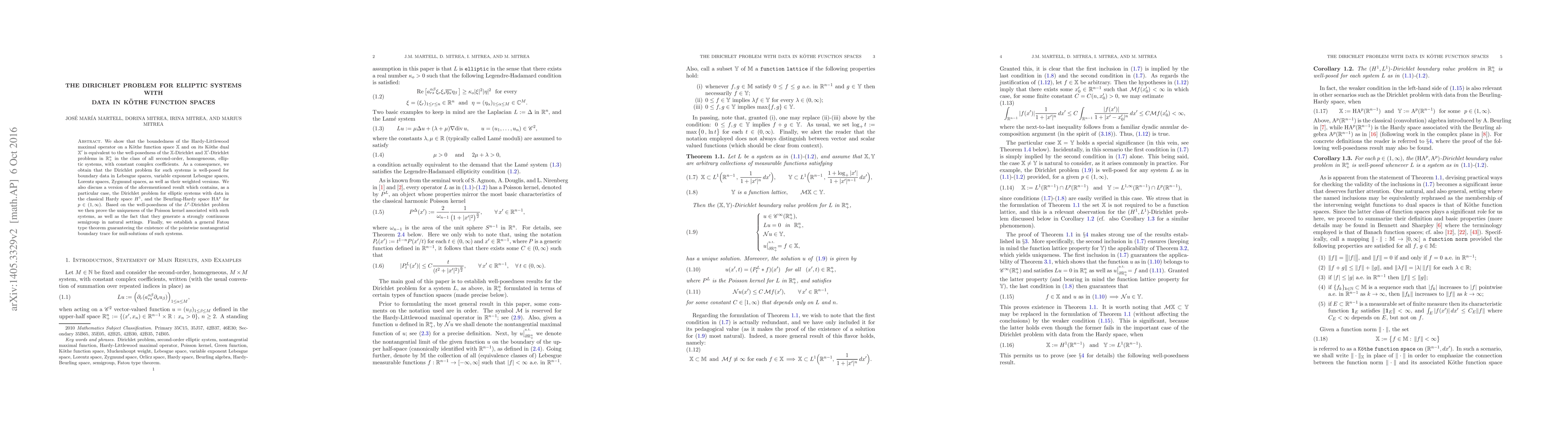 This paper establishes the equivalence between the boundedness of the Hardy-Littlewood maximal operator on K\"othe function spaces and the well-posedness of the $\mathbb{X}$-Dirichlet problem for elliptic systems. It also proves the uniqueness of the Poisson kernel and the existence of pointwise nontangential boundary traces for null-solutions.