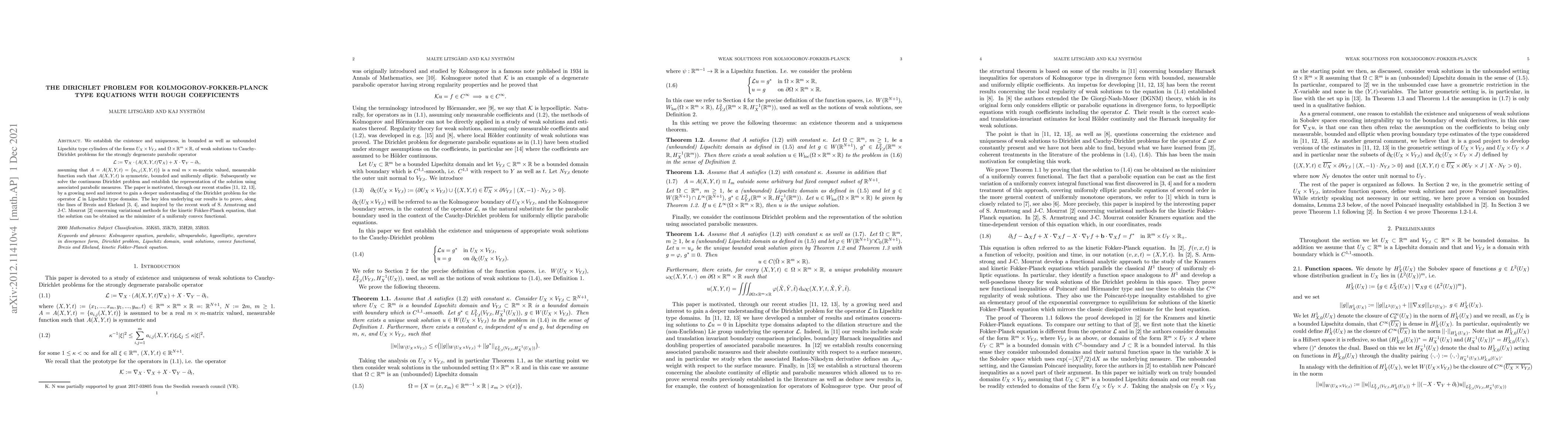 We establish the existence and uniqueness, in bounded as well as unbounded Lipschitz type cylinders of the forms $U_X\times V_{Y,t}$ and $\Omega\times \mathbb R^{m}\times \mathbb R$, of weak solutions to Cauchy-Dirichlet problems for the strongly degenerate parabolic operator \[ \mathcal{L}:= \nabla_X\cdot(A(X,Y,t)\nabla_X)+X\cdot\nabla_Y-\partial_t, \] assuming that $A=A(X,Y,t)=\{a_{i,j}(X,Y,t)\}$ is a real $m\times m$-matrix valued, measurable function such that $A(X,Y,t)$ is symmetric, bounded and uniformly elliptic. Subsequently we solve the continuous Dirichlet problem and establish the representation of the solution using associated parabolic measures. The paper is motivated, through our recent studies, arXiv:2012.03654, arXiv:2012.04278, arXiv:2012.07446, by a growing need and interest to gain a deeper understanding of the Dirichlet problem for the operator $\mathcal{L}$ in Lipschitz type domains. The key idea underlying our results is to prove, along the lines of Brezis and Ekeland, and in particular following the recent work of S. Armstrong and J-C. Mourrat, arXiv:1902.04037, concerning variational methods for the kinetic Fokker-Planck equation, that the solution can be obtained as the minimizer of a uniformly convex functional.