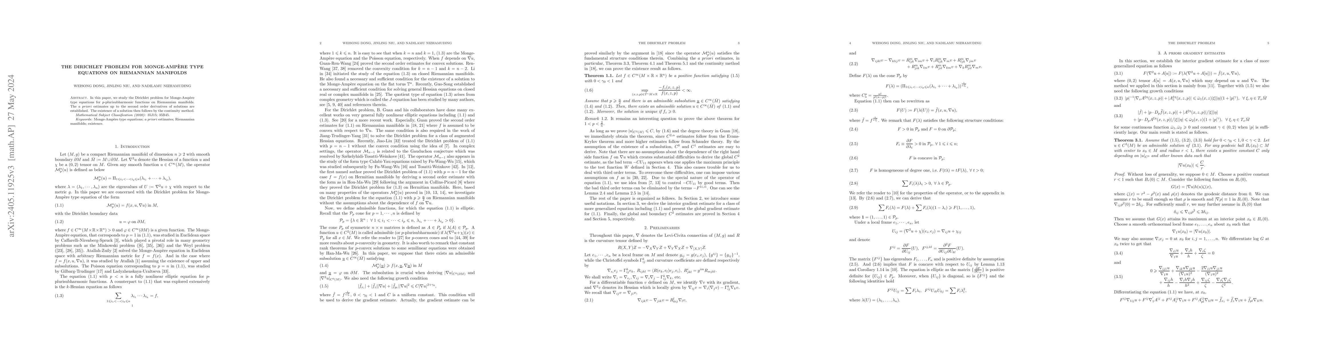This paper investigates the Dirichlet problem for Monge-Ampère type equations on Riemannian manifolds, establishing $a$ priori estimates for solutions' second-order derivatives, and proving the existence of a solution using the continuity method.