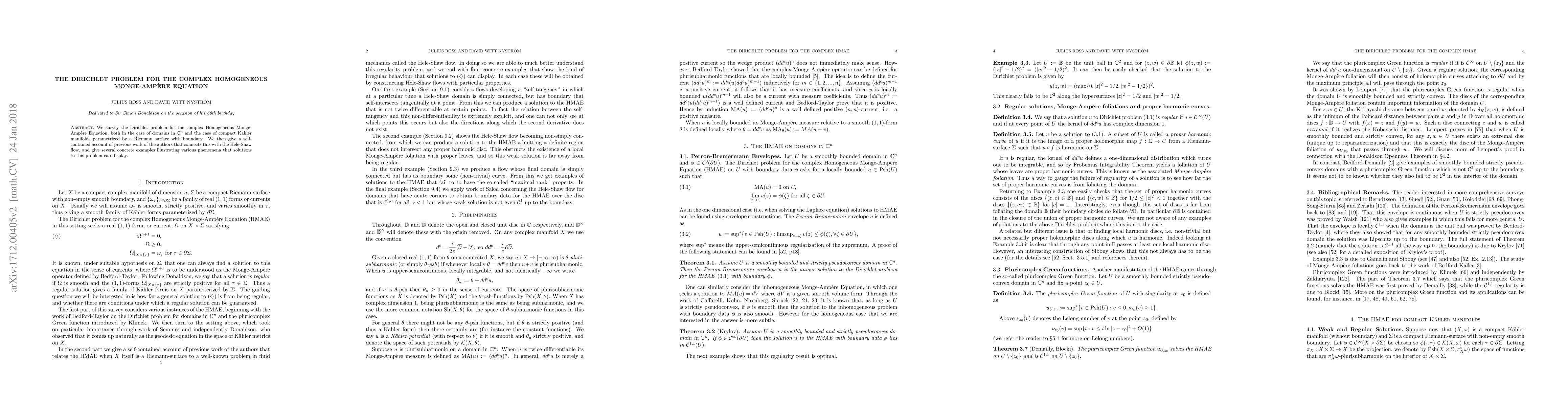 We survey the Dirichlet problem for the complex Homogeneous Monge-Amp\`ere Equation, both in the case of domains in $\mathbb C^n$ and the case of compact K\"ahler manifolds parametrized by a Riemann surface with boundary. We then give a self-contained account of previous work of the authors that connects this with the Hele-Shaw flow, and give several concrete examples illustrating various phenomena that solutions to this problem can display.