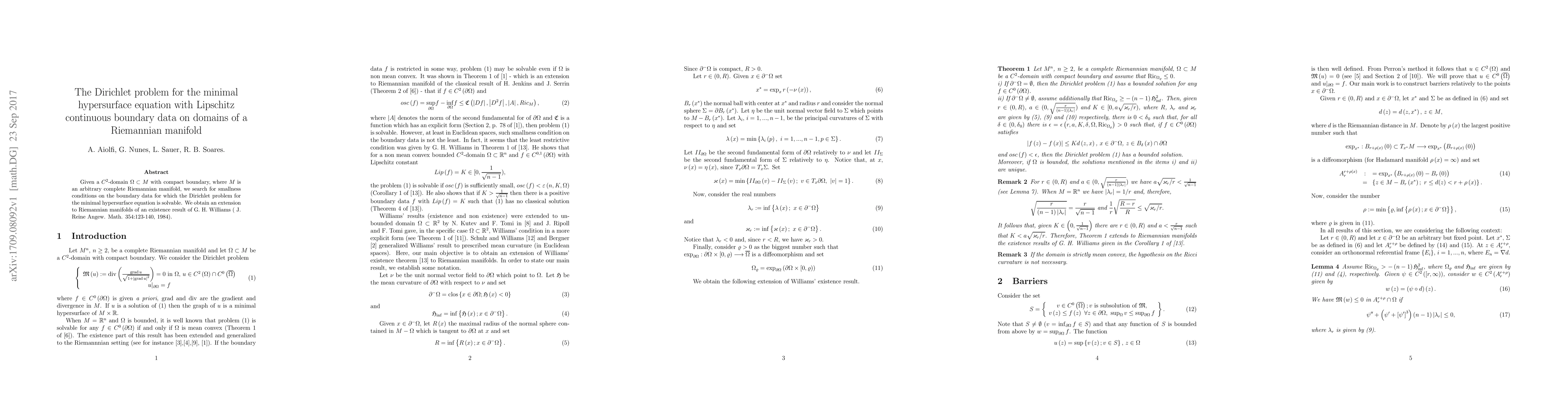 Given a C2-domain with compact boundary in an arbitrary complete Riemannian manifold, we search for smallness conditions on the boundary data for which the Dirichlet problem for the minimal hypersurface equation is solvable. We obtain an extension to Riemannian manifolds of an existence result of G. H. Williams ( J. Reine Angew. Math. 354:123-140, 1984).