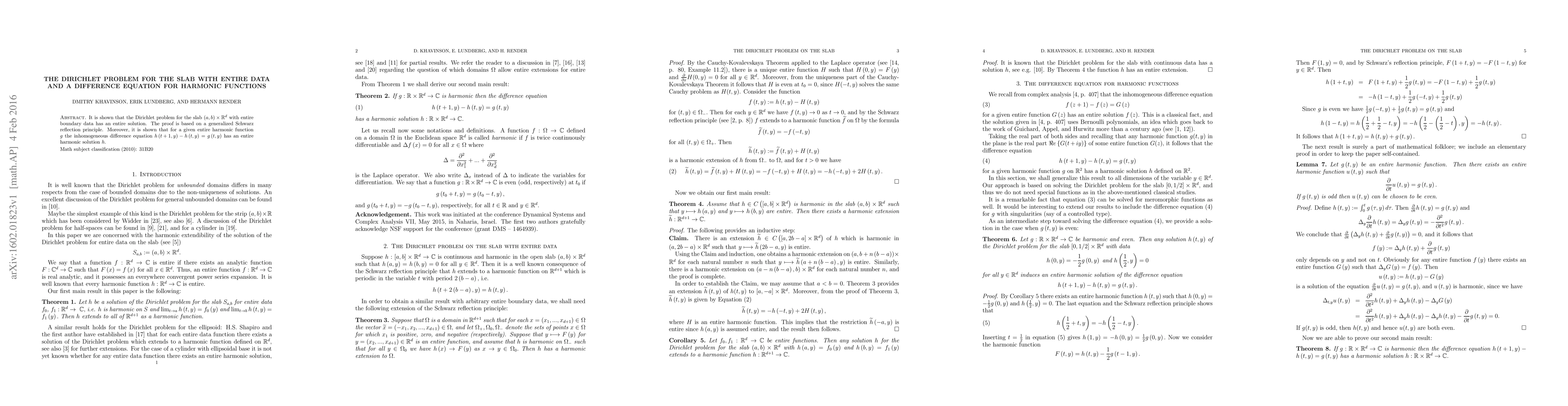 It is shown that the Dirichlet problem for the slab $(a,b) \times \mathbb{R}^{d}$ with entire boundary data has an entire solution. The proof is based on a generalized Schwarz reflection principle. Moreover, it is shown that for a given entire harmonic function $g$ the inhomogeneous difference equation $h\left( t+1,y\right) -h\left(t,y\right) =g\left(t,y\right)$ has an entire harmonic solution $h$.