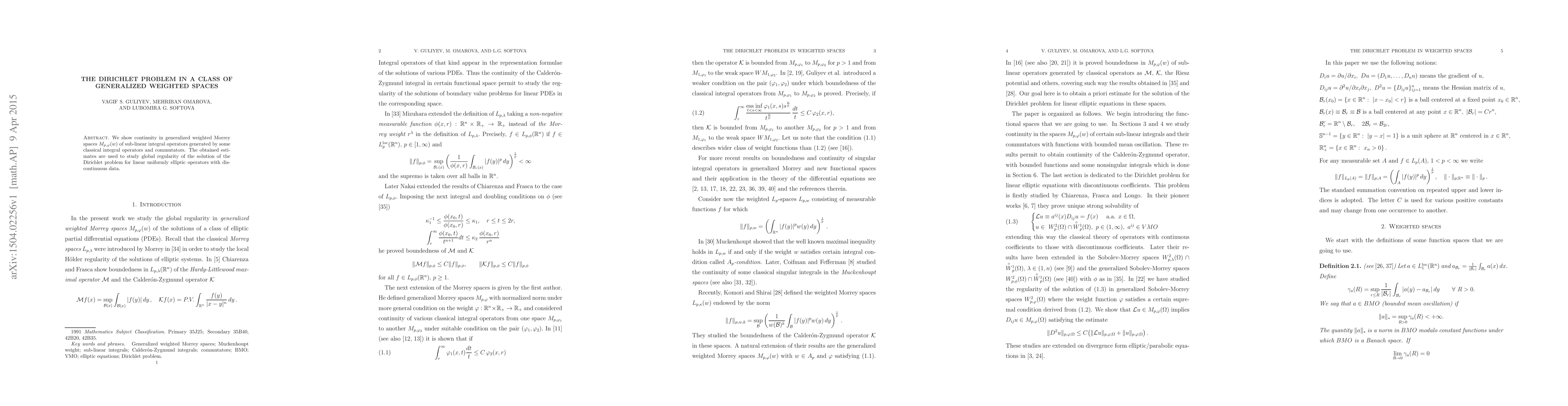 The research demonstrates continuity of sub-linear integral operators in generalized weighted Morrey spaces and utilizes these estimates to achieve global regularity for solutions of the Dirichlet problem in linear uniformly elliptic operators with discontinuous data.