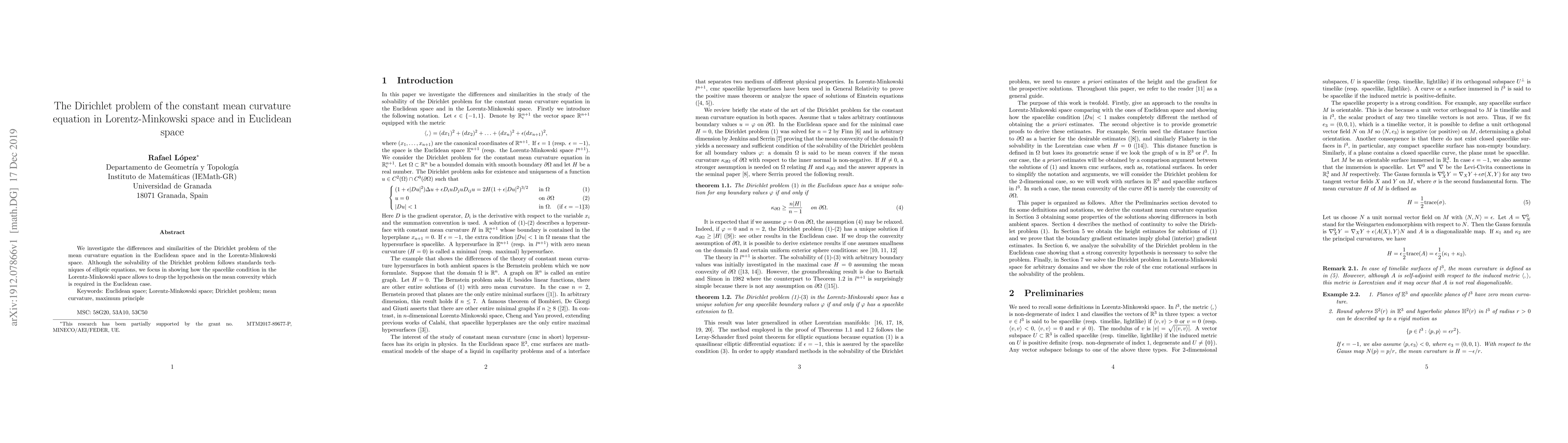 Summary: This paper examines the Dirichlet problem for the mean curvature equation in both Euclidean and Lorentz-Minkowski spaces, highlighting that the solvability techniques are similar but the Lorentz-Minkowski space permits the solution without requiring mean convexity, unlike the Euclidean case.