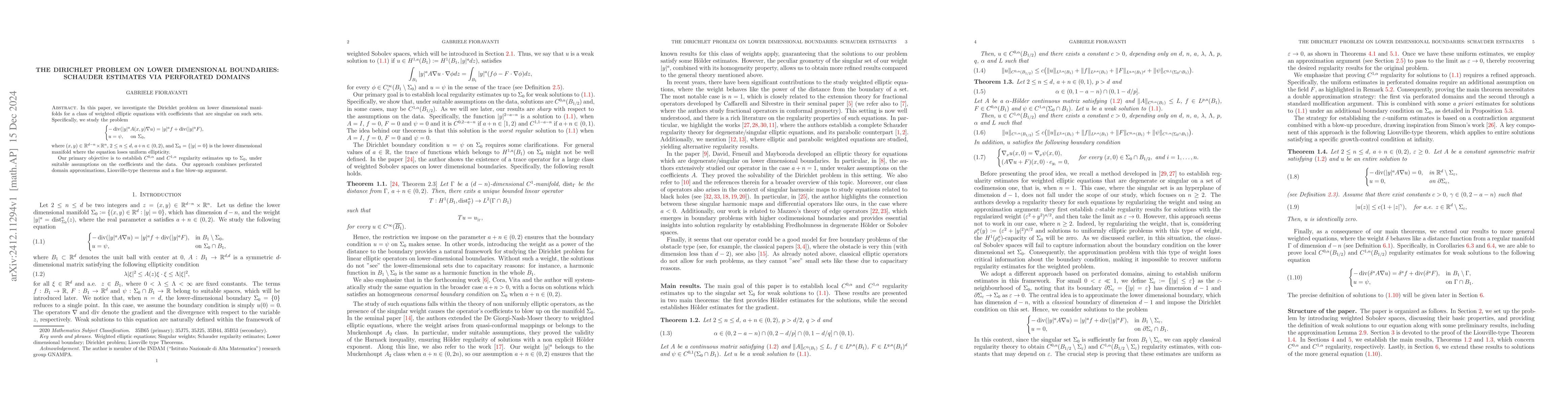 This paper addresses the Dirichlet problem for weighted elliptic equations on lower dimensional manifolds using Schauder estimates. It establishes $C^{0,\alpha}$ and $C^{1,\alpha}$ regularity estimates via perforated domain approximations, leveraging Liouville-type theorems and fine blow-up arguments.
