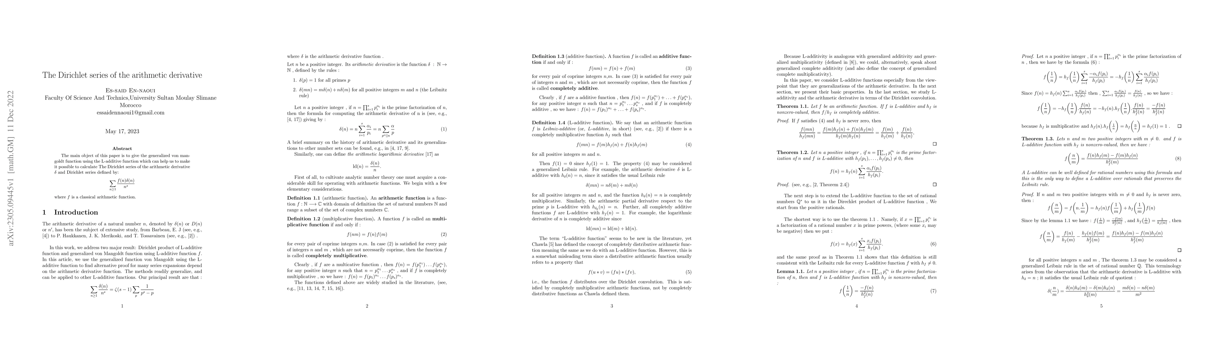The main object of this paper is to give the generalized von mangoldt function using the L-additive function which can help us to make it possible to calculate The Dirichlet series of the arithmetic derivative $\delta$ and Dirichlet series defined by: $$\sum \limits_{n\geq 1} \frac{f(n)\delta(n)}{n^s}$$ where $f$ is a classical arithmetic function.