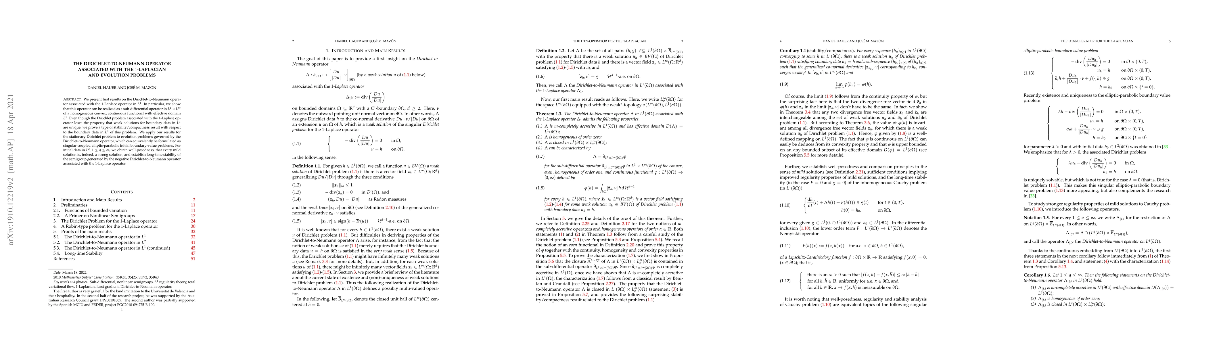 This paper investigates the Dirichlet-to-Neumann operator linked to the $1$-Laplace operator, demonstrating its realization as a sub-differential operator in $L^1\times L^{\infty}$. It establishes stability and compactness results for boundary data in $L^1$ and applies these findings to evolution problems, proving well-posedness and long-time stability for associated semigroups.