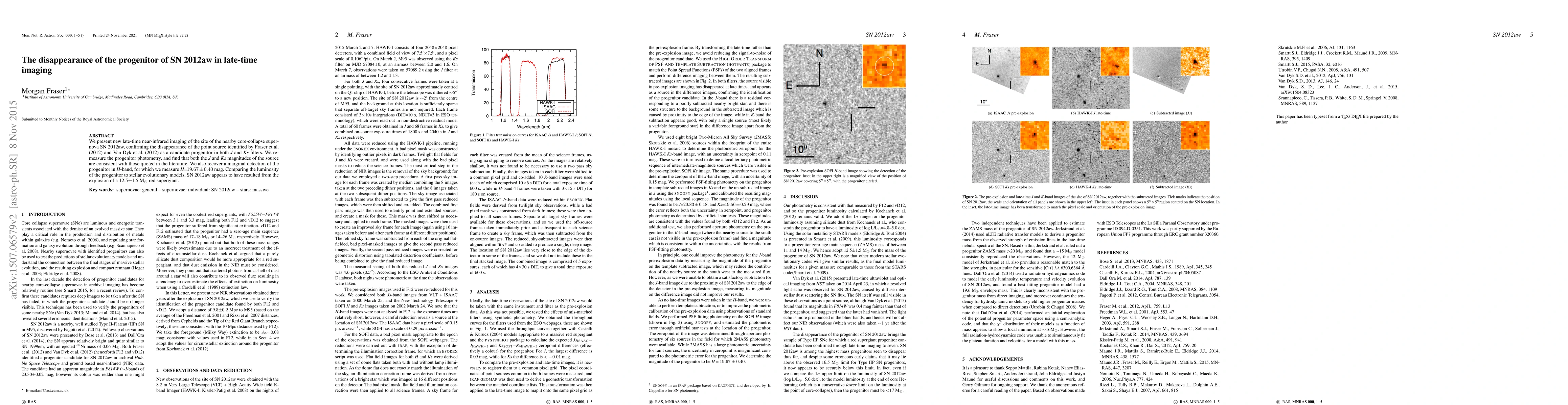We present new late-time near-infrared imaging of the site of the nearby core-collapse supernova SN 2012aw, confirming the disappearance of the point source identified by Fraser et al. (2012) and Van Dyk et al. (2012) as a candidate progenitor in both J and Ks filters. We re-measure the progenitor photometry, and find that both the J and Ks magnitudes of the source are consistent with those quoted in the literature. We also recover a marginal detection of the progenitor in H-band, for which we measure H=19.67+/-0.40 mag. Comparing the luminosity of the progenitor to stellar evolutionary models, SN 2012aw appears to have resulted from the explosion of a 12.5+/-1.5 Msun red supergiant.