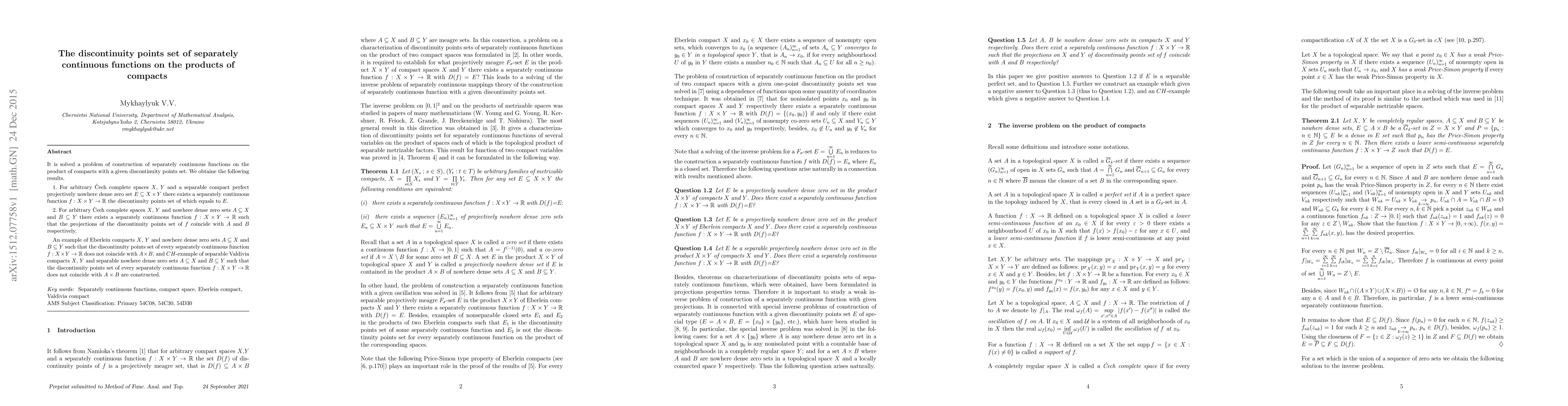 This paper constructs separately continuous functions on the product of compact spaces with specified discontinuity point sets. The results include the existence of such functions for separable compact perfect projectively nowhere dense zero sets and nowhere dense zero sets, while also providing counterexamples where the discontinuity set does not match expected projections.