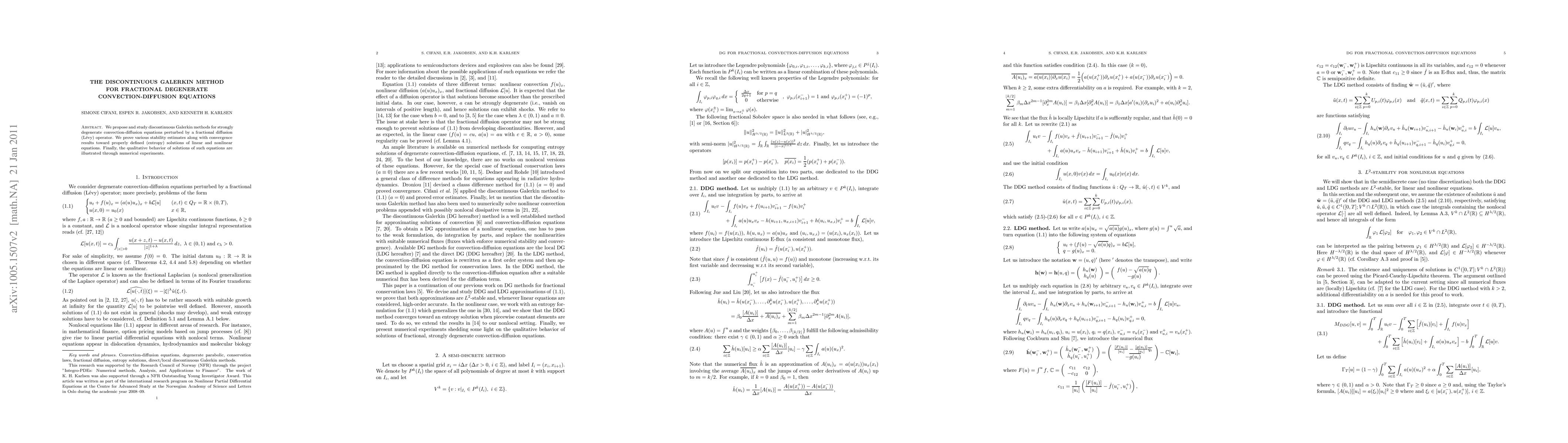 This paper proposes discontinuous Galerkin methods for solving strongly degenerate convection-diffusion equations with fractional diffusion, proving stability and convergence to entropy solutions. Numerical experiments demonstrate the qualitative behavior of solutions.