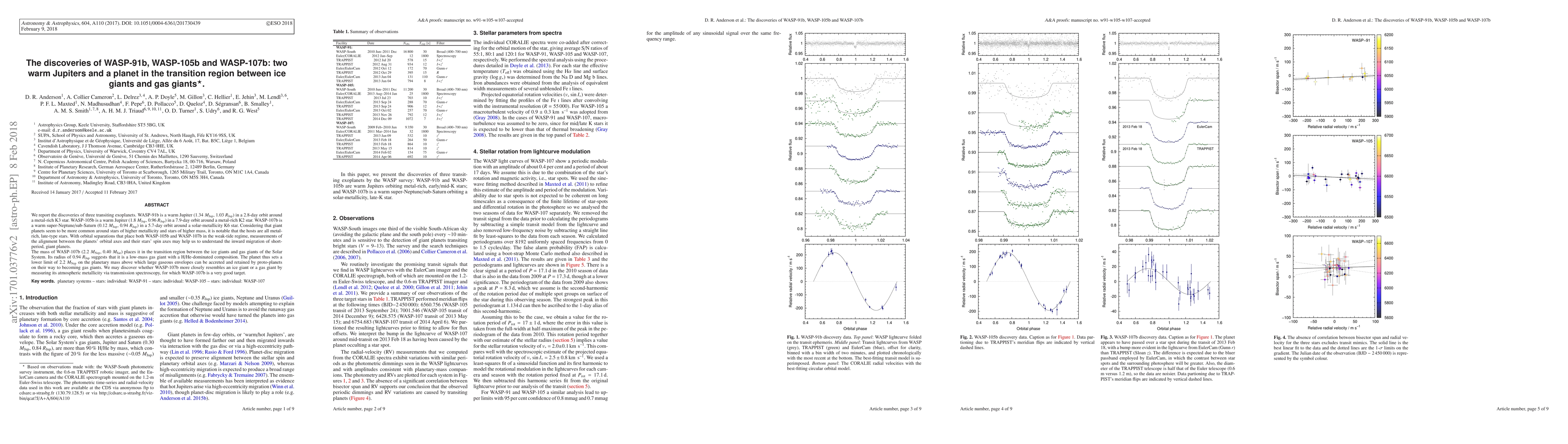 We report the discoveries of three transiting exoplanets. WASP-91b is a warm Jupiter (1.34 $M_{\rm Jup}$, 1.03 $R_{\rm Jup}$) in a 2.8-day orbit around a metal-rich K3 star. WASP-105b is a warm Jupiter (1.8 $M_{\rm Jup}$, 0.96 $R_{\rm Jup}$) in a 7.9-day orbit around a metal-rich K2 star. WASP-107b is a warm super-Neptune/sub-Saturn (0.12 $M_{\rm Jup}$, 0.94 $R_{\rm Jup}$) in a 5.7-day orbit around a solar-metallicity K6 star. Considering that giant planets seem to be more common around stars of higher metallicity and stars of higher mass, it is notable that the hosts are all metal-rich, late-type stars. With orbital separations that place both WASP-105b and WASP-107b in the weak-tide regime, measurements of the alignment between the planets' orbital axes and their stars' spin axes may help us to understand the inward migration of short-period, giant planets. The mass of WASP-107b (2.2 $M_{\rm Nep}$, 0.40 $M_{\rm Sat}$) places it in the transition region between the ice giants and gas giants of the Solar System. Its radius of 0.94 $R_{\rm Jup}$ suggests that it is a low-mass gas giant with a H/He-dominated composition. The planet thus sets a lower limit of 2.2 $M_{\rm Nep}$ on the planetary mass above which large gaseous envelopes can be accreted and retained by proto-planets on their way to becoming gas giants. We may discover whether WASP-107b more closely resembles an ice giant or a gas giant by measuring its atmospheric metallicity via transmission spectroscopy, for which WASP-107b is a very good target.