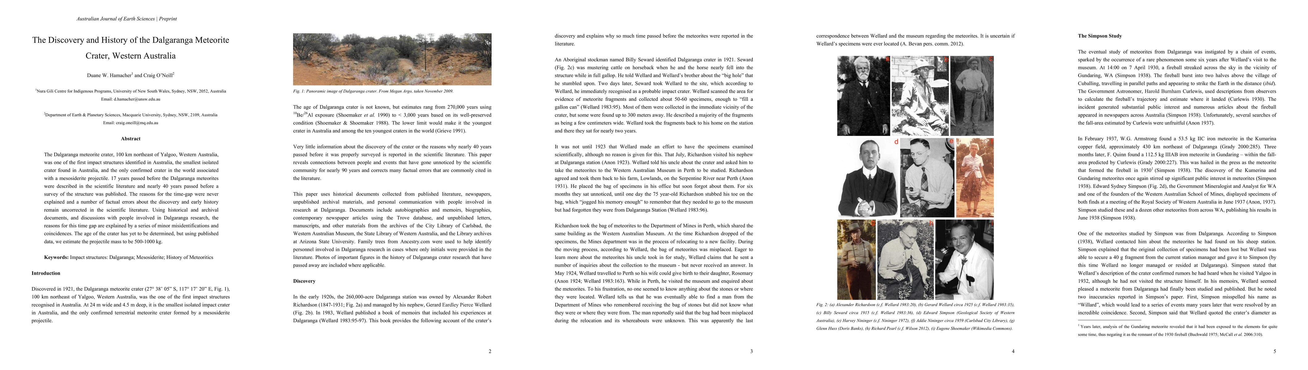 The Dalgaranga meteorite crater in Western Australia was one of the first identified impact structures in Australia, linked to a mesosiderite projectile. A significant time gap between its discovery and scientific documentation was due to minor misidentifications and coincidences.