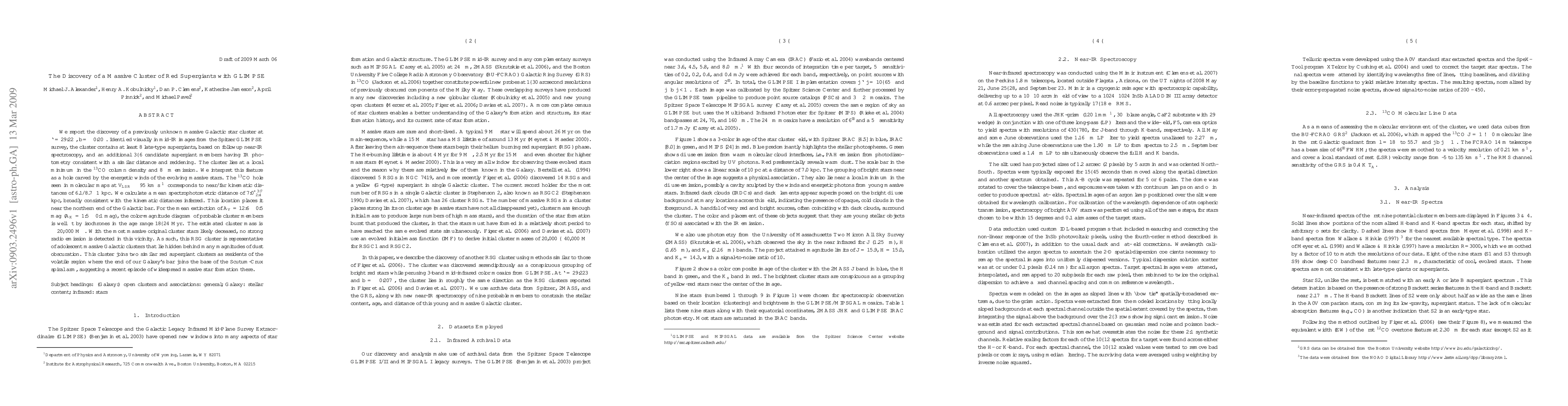 The GLIMPSE survey identified a massive, previously unknown Galactic star cluster containing at least 8 red supergiants, located near the northern end of the Galactic bar, with an estimated mass of ~20,000 solar masses and an age of 18-24 Myr. The cluster's location in a 13-CO hole suggests it was formed by the energetic winds of its massive stars.