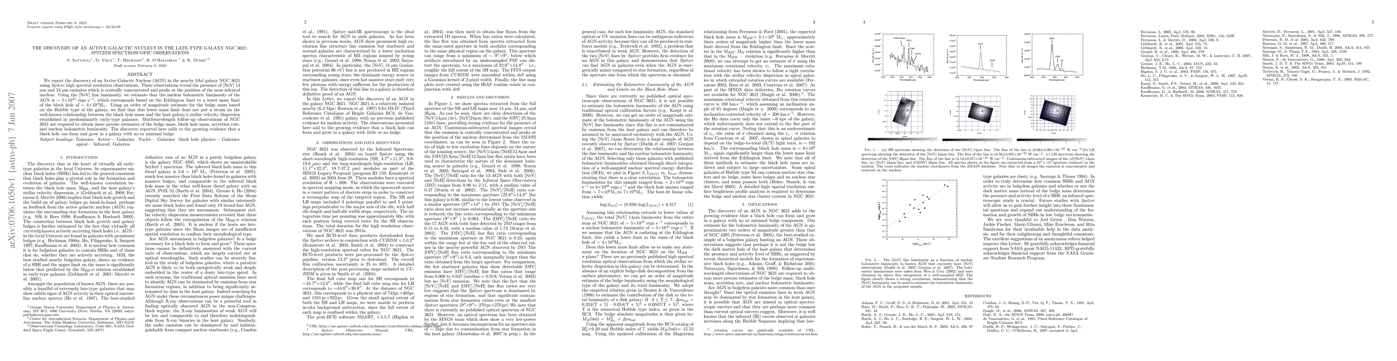 Researchers discovered an Active Galactic Nucleus in a late-type galaxy, NGC 3621, using Spitzer observations, estimating a black hole mass of ~4 X 10^3 Msun without a prominent bulge.