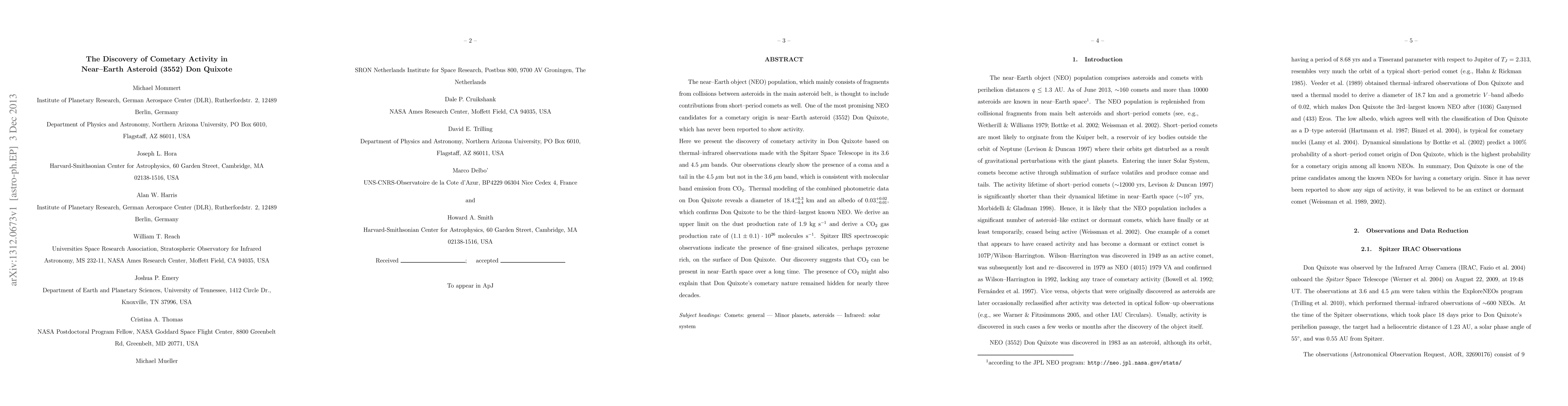 Researchers discovered cometary activity in the near-Earth asteroid (3552) Don Quixote using Spitzer Space Telescope observations, revealing a coma and CO2 gas emission. This finding suggests Don Quixote's long-hidden cometary nature and indicates the presence of CO2 in near-Earth space.