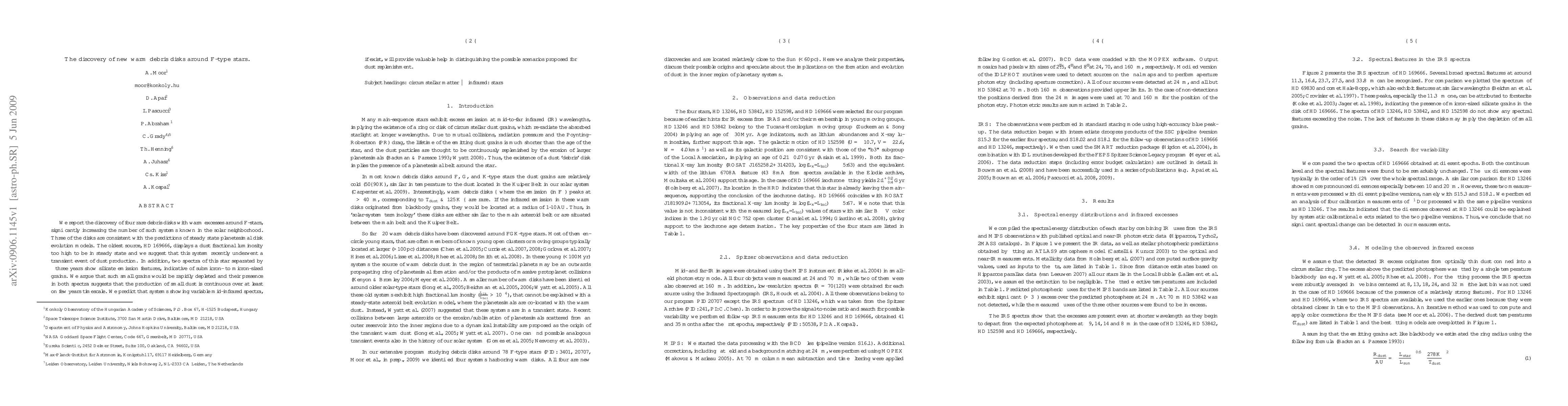 We report the discovery of four rare debris disks with warm excesses around F-stars, significantly increasing the number of such systems known in the solar neighborhood. Three of the disks are consistent with the predictions of steady state planetesimal disk evolution models. The oldest source, HD 169666, displays a dust fractional luminosity too high to be in steady state and we suggest that this system recently underwent a transient event of dust production. In addition, two spectra of this star separated by ~three years show silicate emission features, indicative of submicron- to micron-sized grains. We argue that such small grains would be rapidly depleted and their presence in both spectra suggests that the production of small dust is continuous over at least on few years timescale. We predict that systems showing variable mid-infrared spectra, if exist, will provide valuable help in distinguishing the possible scenarios proposed for dust replenishment.