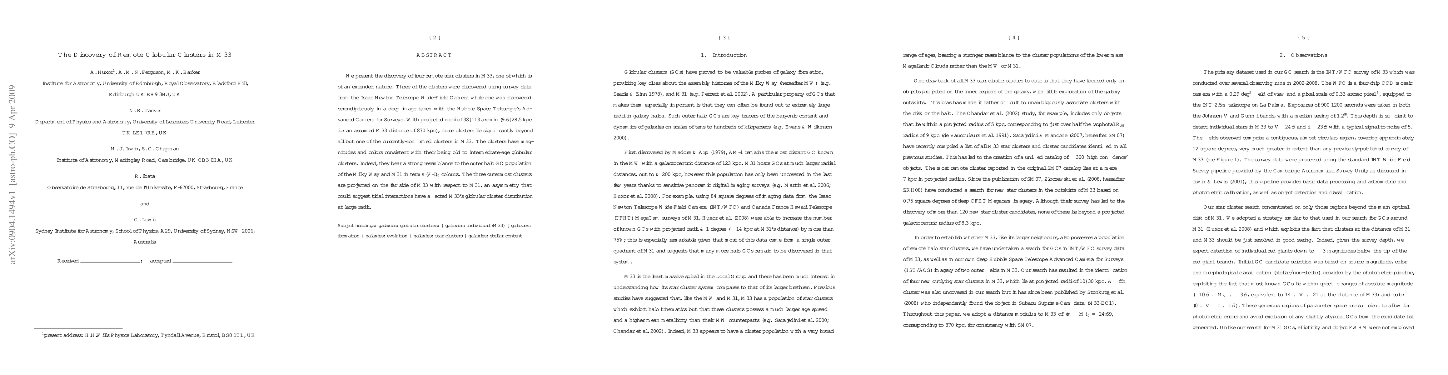 This paper reports the discovery of four remote globular clusters in M33, three found via Isaac Newton Telescope data and one from Hubble Space Telescope images. These clusters, with radii up to 28.5 kpc, extend far beyond previously known clusters and exhibit characteristics similar to outer halo globular clusters in the Milky Way and M31, suggesting tidal interactions may influence M33's globular cluster distribution.
