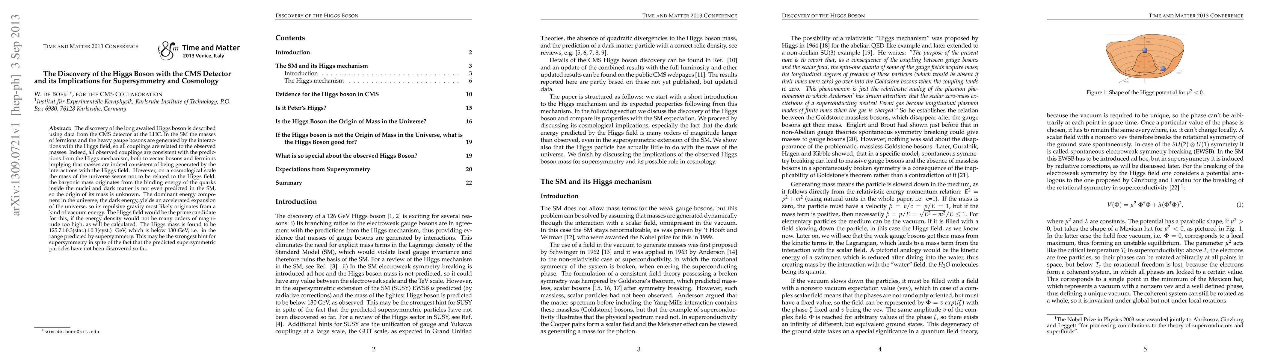 The discovery of the long awaited Higgs boson is described using data from the CMS detector at the LHC. In the SM the masses of fermions and the heavy gauge bosons are generated by the interactions with the Higgs field, so all couplings are related to the observed masses. Indeed, all observed couplings are consistent with the predictions from the Higgs mechanism, both to vector bosons and fermions implying that masses are indeed consistent of being generated by the interactions with the Higgs field. However, on a cosmological scale the mass of the universe seems not to be related to the Higgs field: the baryonic mass originates from the binding energy of the quarks inside the nuclei and dark matter is not even predicted in the SM, so the origin of its mass is unknown. The dominant energy component in the universe, the dark energy, yields an accelerated expansion of the universe, so its repulsive gravity most likely originates from a kind of vacuum energy. The Higgs field would be the prime candidate for this, if the energy density would not be many orders of magnitude too high, as will be calculated. The Higgs mass is found to be 125.7$\pm$0.3(stat.)$\pm$0.3(syst.) GeV, which is below 130 GeV, i.e. in the range predicted by supersymmetry. This may be the strongest hint for supersymmetry in spite of the fact that the predicted supersymmetric particles have not been discovered so far.