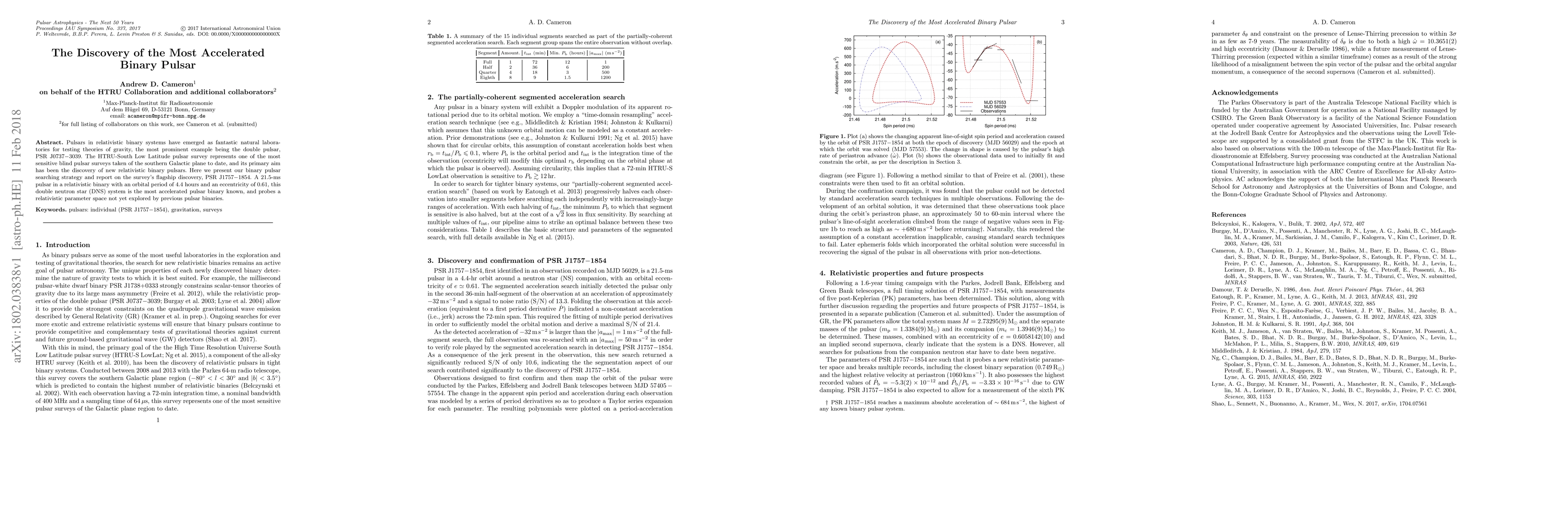 The HTRU-South Low Latitude pulsar survey discovered PSR J1757$-$1854, a 21.5-ms pulsar in a highly accelerated binary system with an orbital period of 4.4 hours and eccentricity of 0.61, making it the most accelerated binary pulsar known and providing new insights into relativistic gravity.