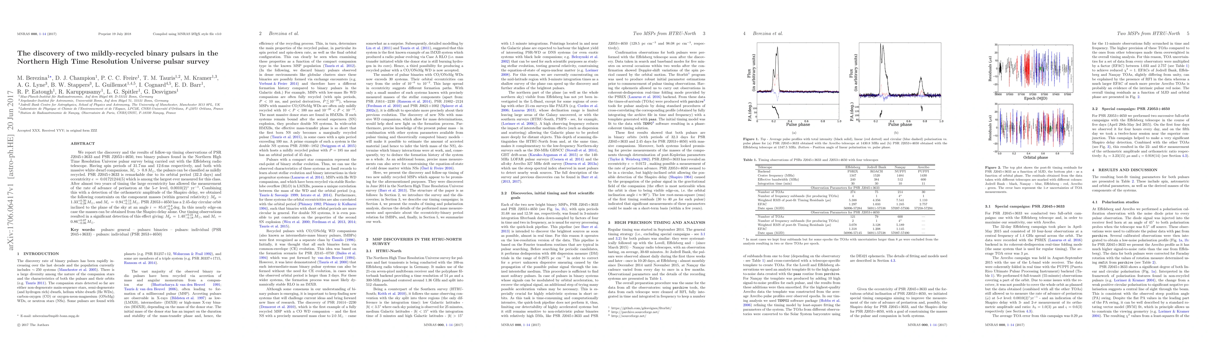 This paper reports the discovery of two mildly recycled binary pulsars, PSR J2045+3633 and PSR J2053+4650, found in the Northern High Time Resolution Universe pulsar survey. Detailed timing observations reveal significant mass constraints and unique orbital characteristics for both pulsars.